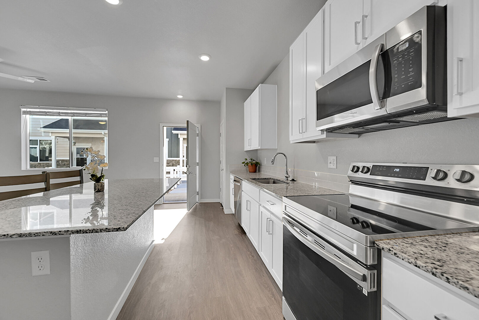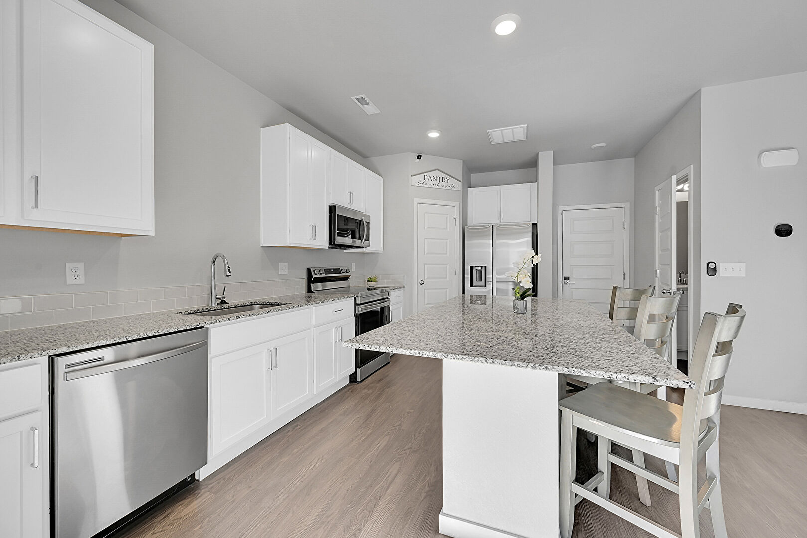 Baseboards Wall, Ceiling Fan, Drywall, Kitchen Bar, Kitchen Island, L Shaped Kitchen, Natural Light, Opens To Living Area, Recessed Lighting, Shaker Cabinets, Stone Countertops, Vent, Wood Finish Floor, Drywall, Recessed Lighting, Stone Countertops, Wood Finish Floor