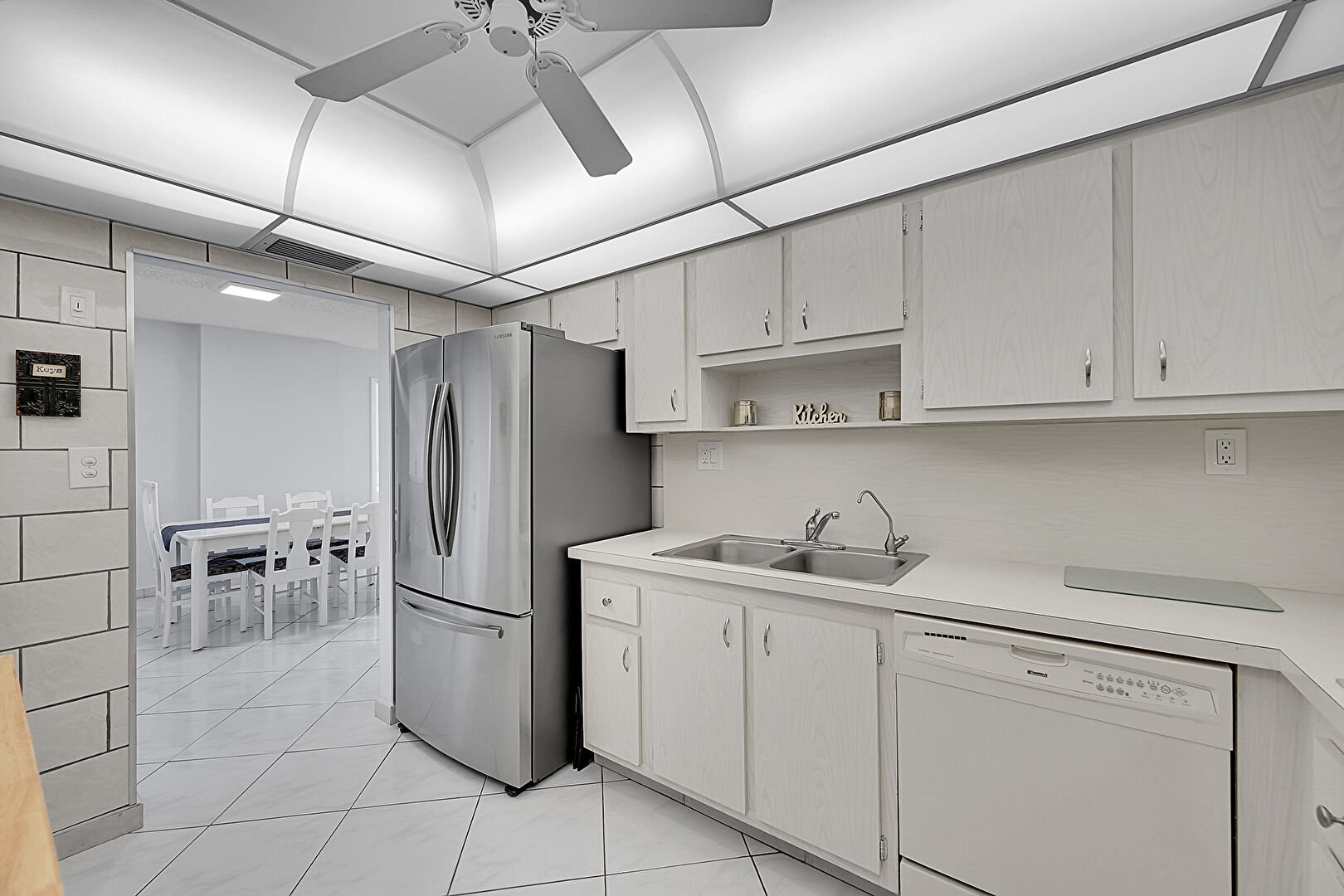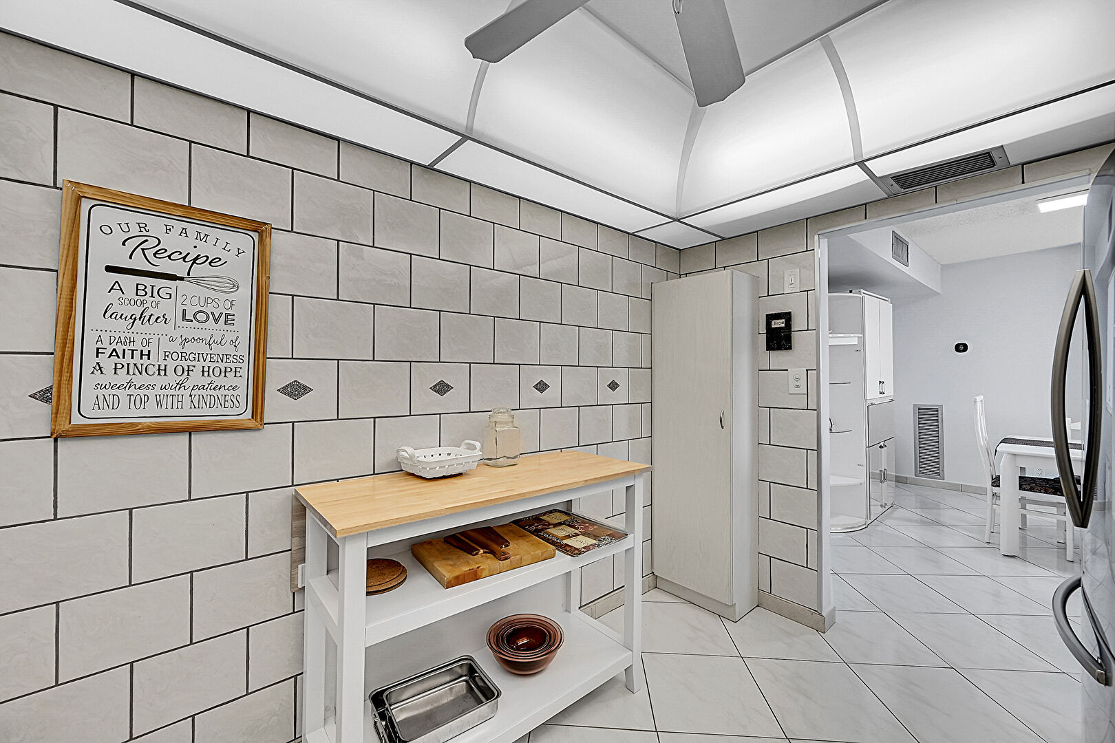 Butcher Block Countertops, Ceiling Fan, Tile Floor, Tile Wall, Tray Ceiling, Visible Hinge Cabinets, Open Shelves, Vent, Visible Hinge Cabinets