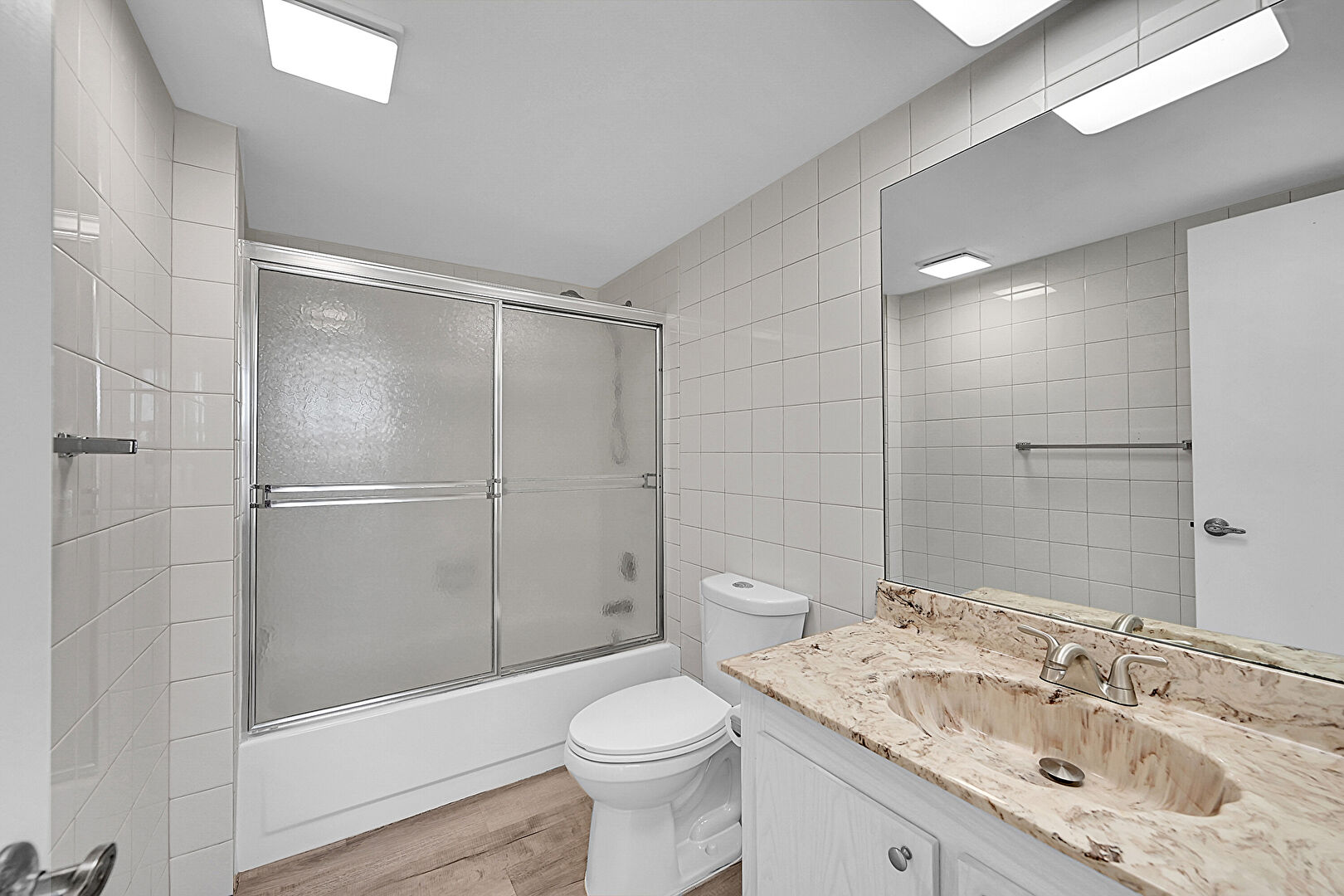 Full Bathroom, Tile Wall, Vanity, Wood Finish Floor, Combined Bath Shower