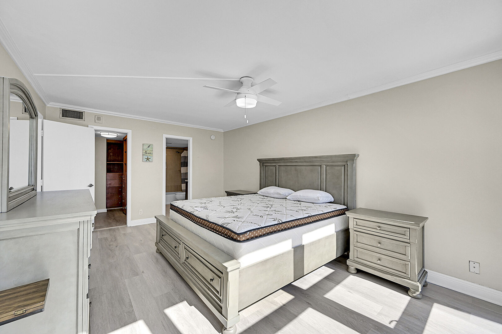 Baseboards Wall, Ceiling Fan, Crown Molding, Drywall, Ensuite Bathroom, Floor Ceiling Windows, Natural Light, Vent, Walk In Closet, Water View, Wood Finish Floor, Drywall, Water View, Wood Finish Floor