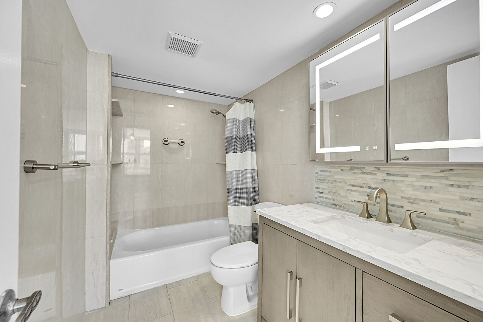 Full Bathroom, Recessed Lighting, Tile Floor, Vanity, Vent, Tile Wall