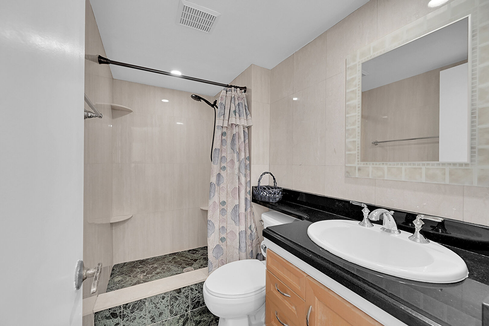 Combined Bath Shower, Recessed Lighting, Tile Floor, Vanity, Vent, Full Bathroom