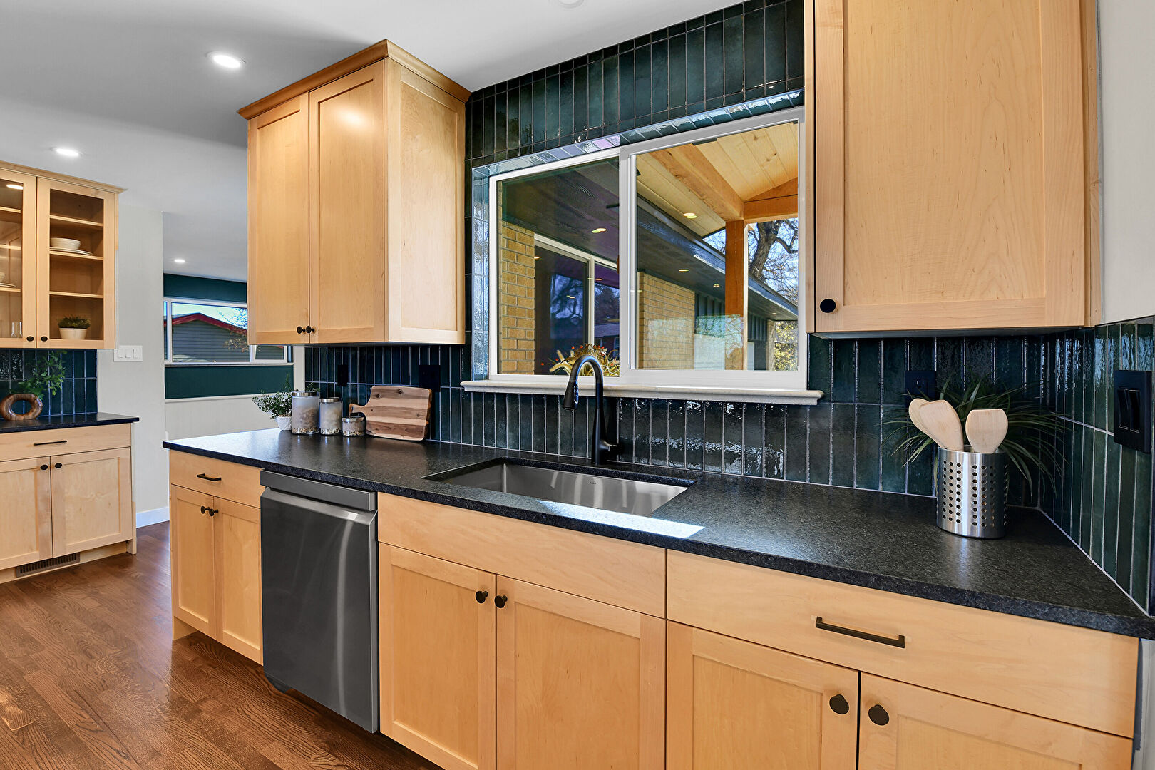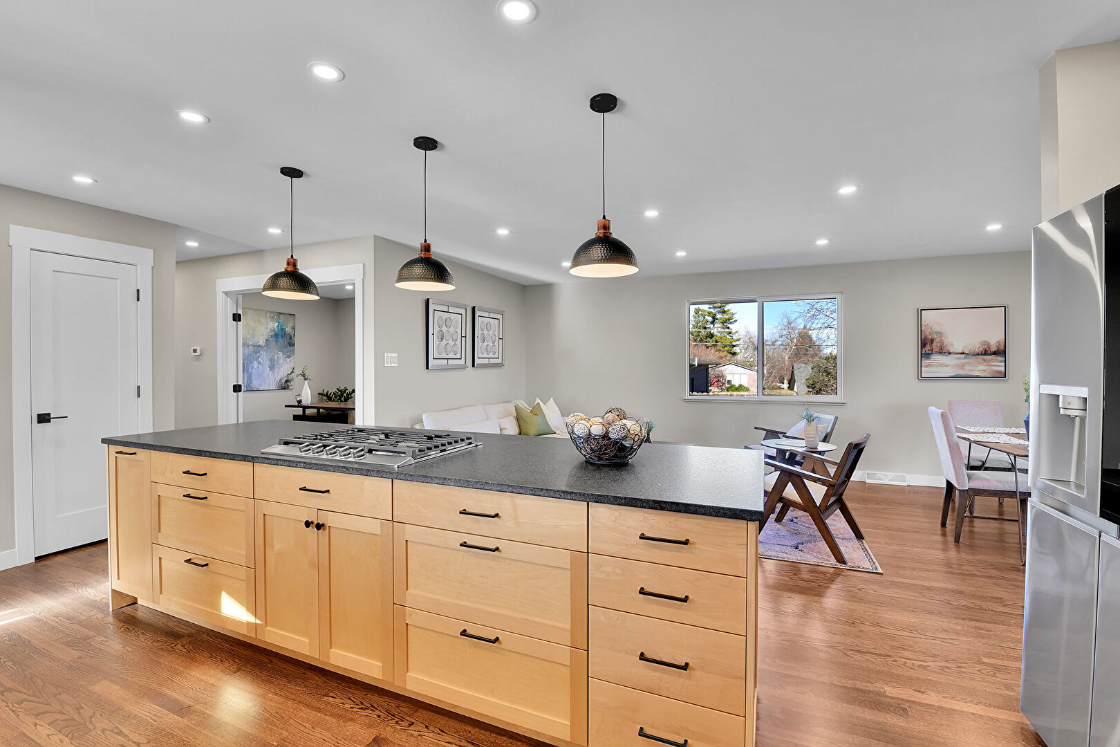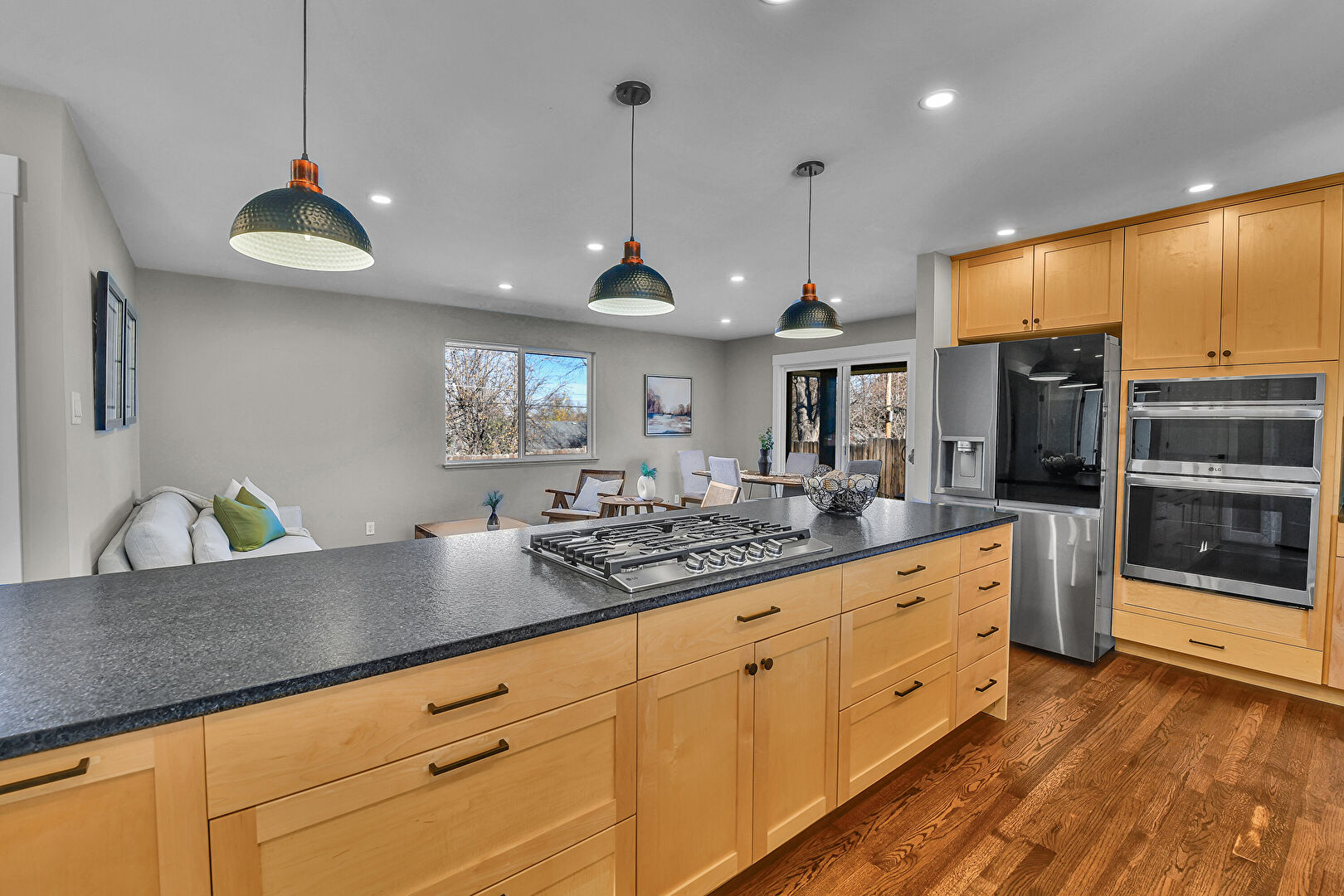 Baseboards Wall, Crown Molding Cabinets, Double Oven, Drywall, Glass Insert Cabinets, Kitchen Bar, Kitchen Island, L Shaped Kitchen, Natural Light, Opens To Living Area, Pendant Lighting, Recessed Lighting, Shaker Cabinets, Stone Countertops, Vent, Wood Finish Floor, Baseboards Wall, Crown Molding Cabinets, Drywall, Recessed Lighting, Shaker Cabinets, Stone Countertops