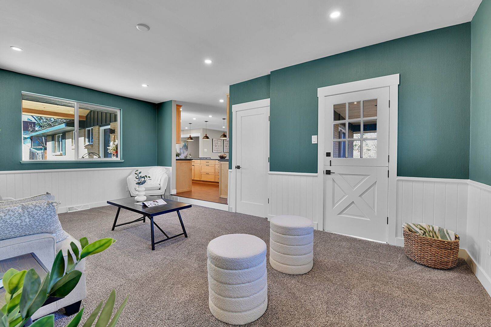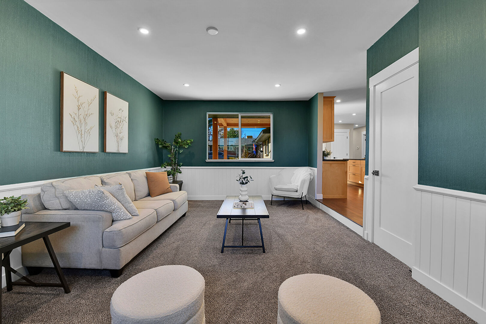 Baseboards Wall, Carpet, Drywall, Natural Light, Paneling Wall, Recessed Lighting, Vent, Wainscot Wall, Carpet, Double Oven, Drywall, Recessed Lighting