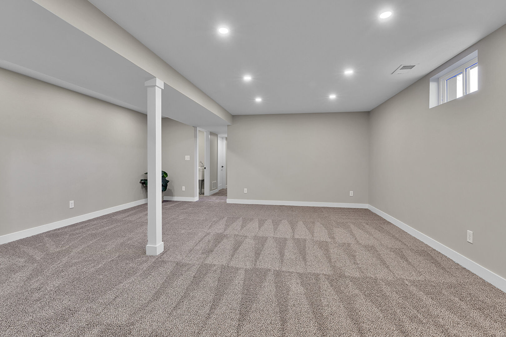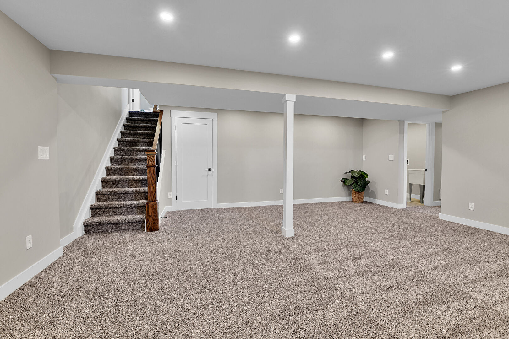 Baseboards Wall, Basement, Carpet, Drywall, Natural Light, Recessed Lighting, Stairs, Vent, Drywall, Natural Light, Vent