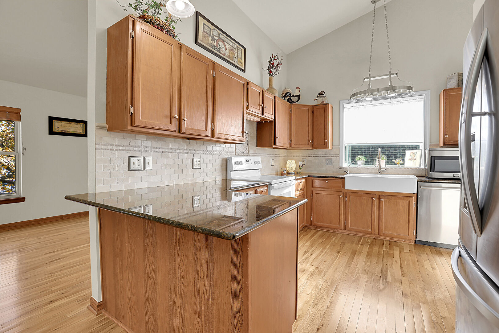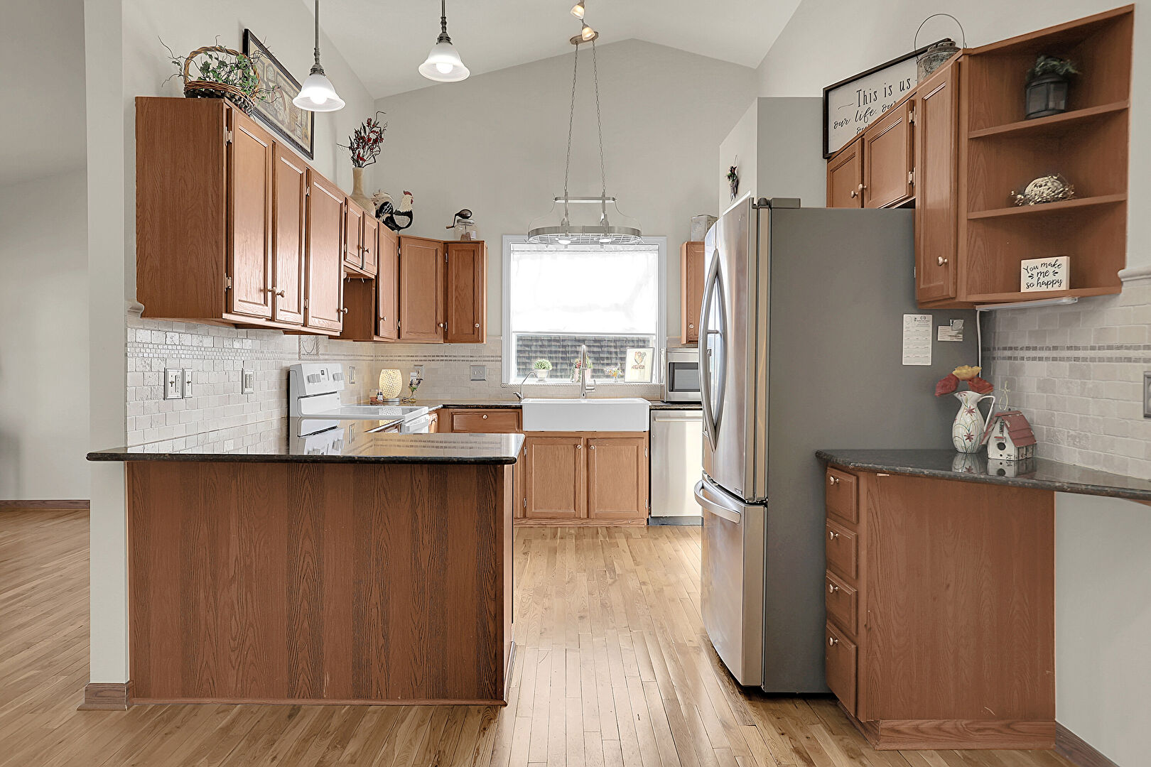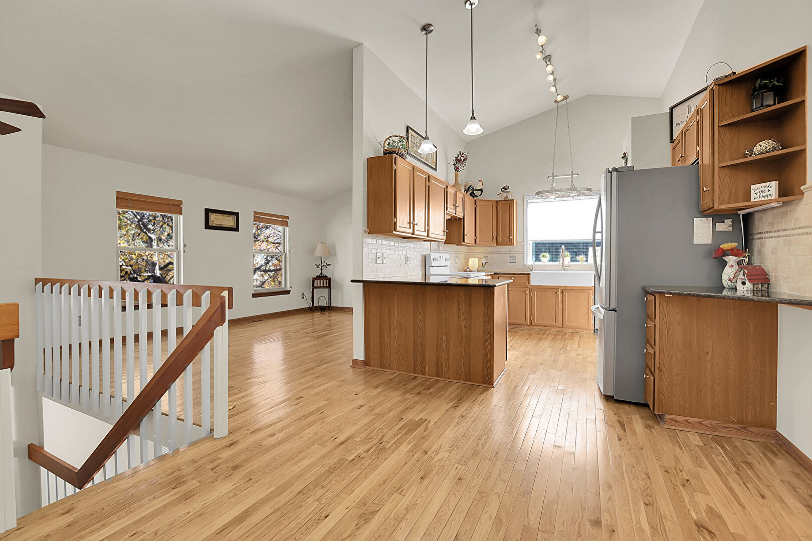 Baseboards Wall, Ceiling Fan, Drywall, G Shaped Kitchen, High Ceiling, Kitchen Bar, Kitchen Peninsula, Medium Brown Cabinets, Natural Light, Open Shelves, Pendant Lighting, Shaker Cabinets, Stone Countertops, Track Lighting, Vaulted Ceiling, Visible Hinge Cabinets, Wall Mounted Ac, Wood Finish Floor, Baseboards Wall, G Shaped Kitchen, Natural Light, Notable Chandelier, Pendant Lighting, Stone Countertops