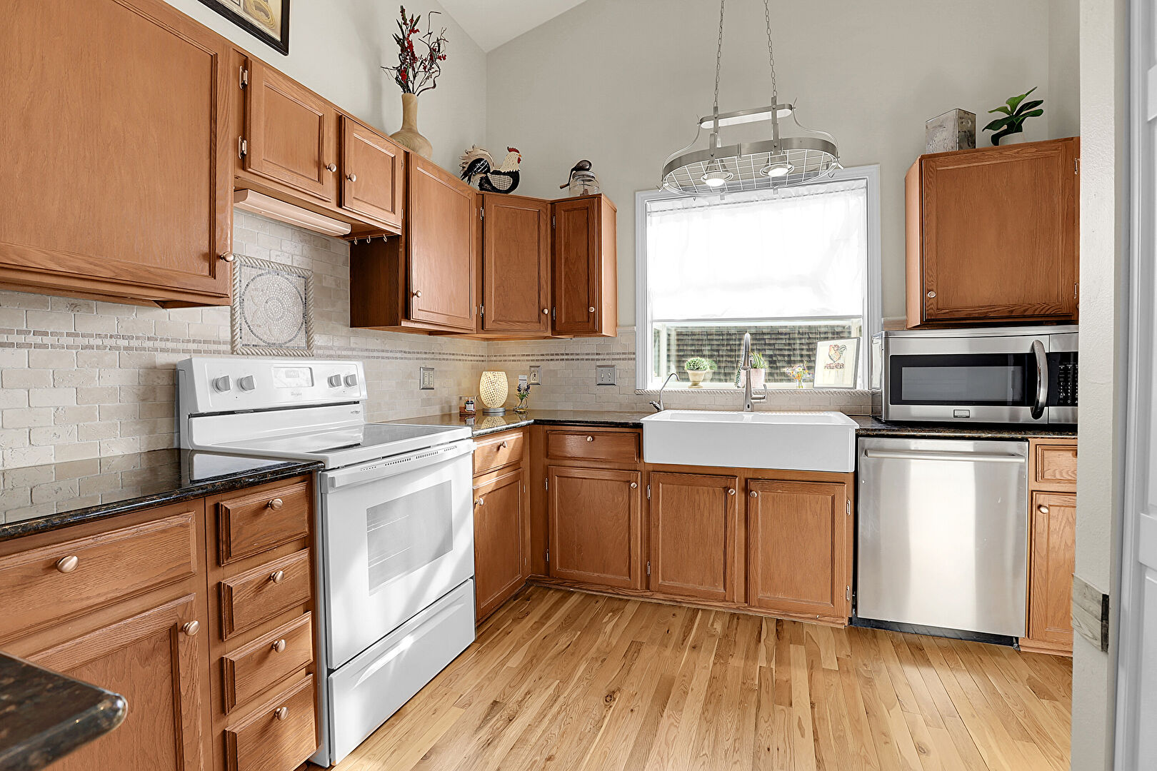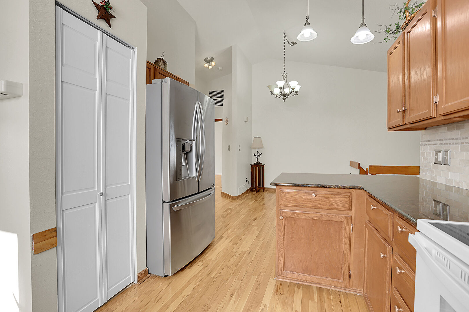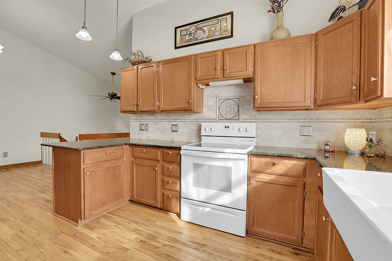 Baseboards Wall, Ceiling Fan, Drywall, G Shaped Kitchen, High Ceiling, Kitchen Bar, Kitchen Peninsula, Medium Brown Cabinets, Natural Light, Open Shelves, Pendant Lighting, Shaker Cabinets, Stone Countertops, Track Lighting, Vaulted Ceiling, Visible Hinge Cabinets, Wall Mounted Ac, Wood Finish Floor, Baseboards Wall, G Shaped Kitchen, Natural Light, Notable Chandelier, Pendant Lighting, Stone Countertops