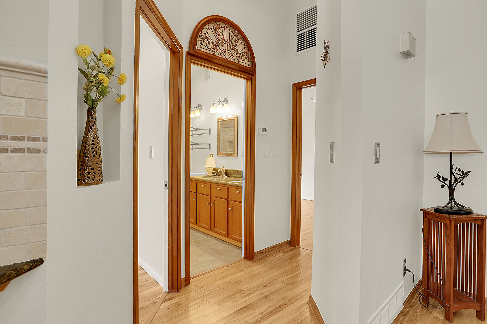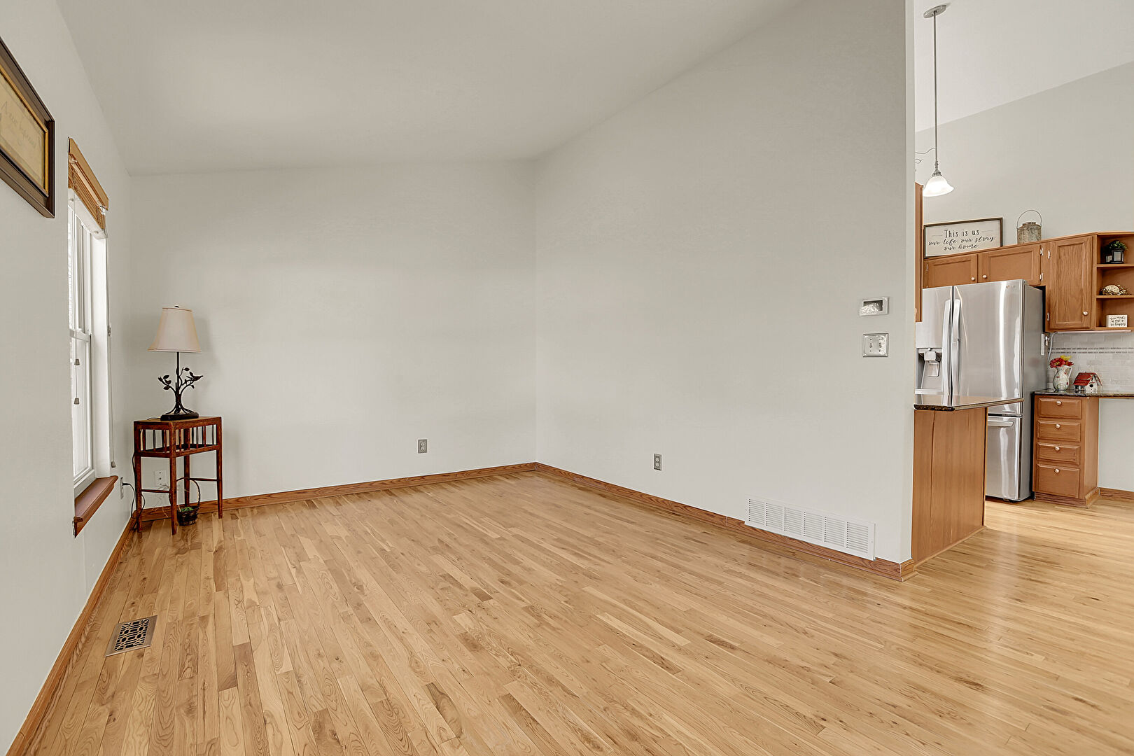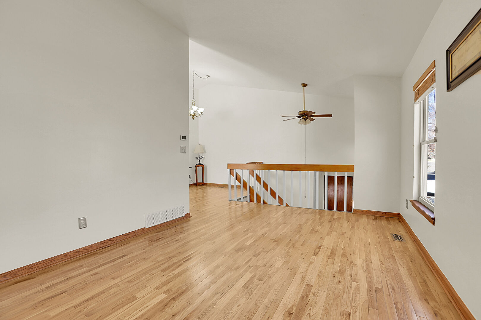 Baseboards Wall, Ceiling Fan, Drywall, High Ceiling, Natural Light, Notable Chandelier, Vaulted Ceiling, Vent, Wood Finish Floor