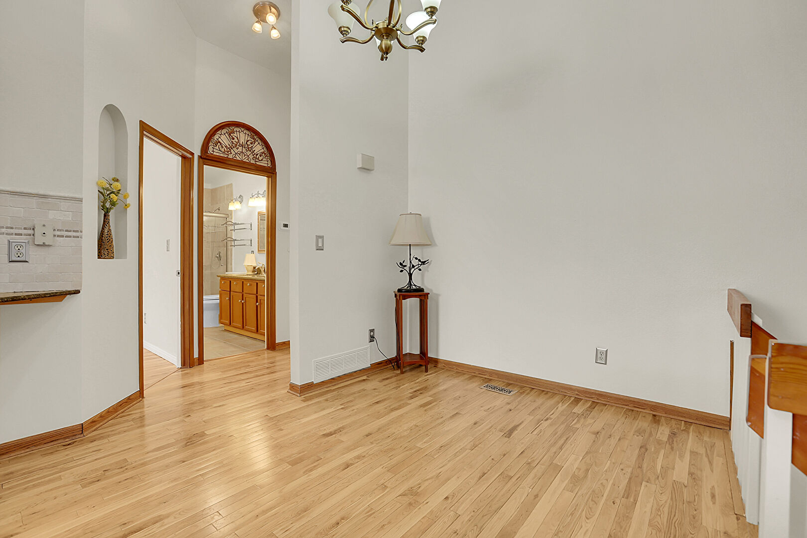 Baseboards Wall, Drywall, Notable Chandelier, Vent, Wood Finish Floor, High Ceiling
