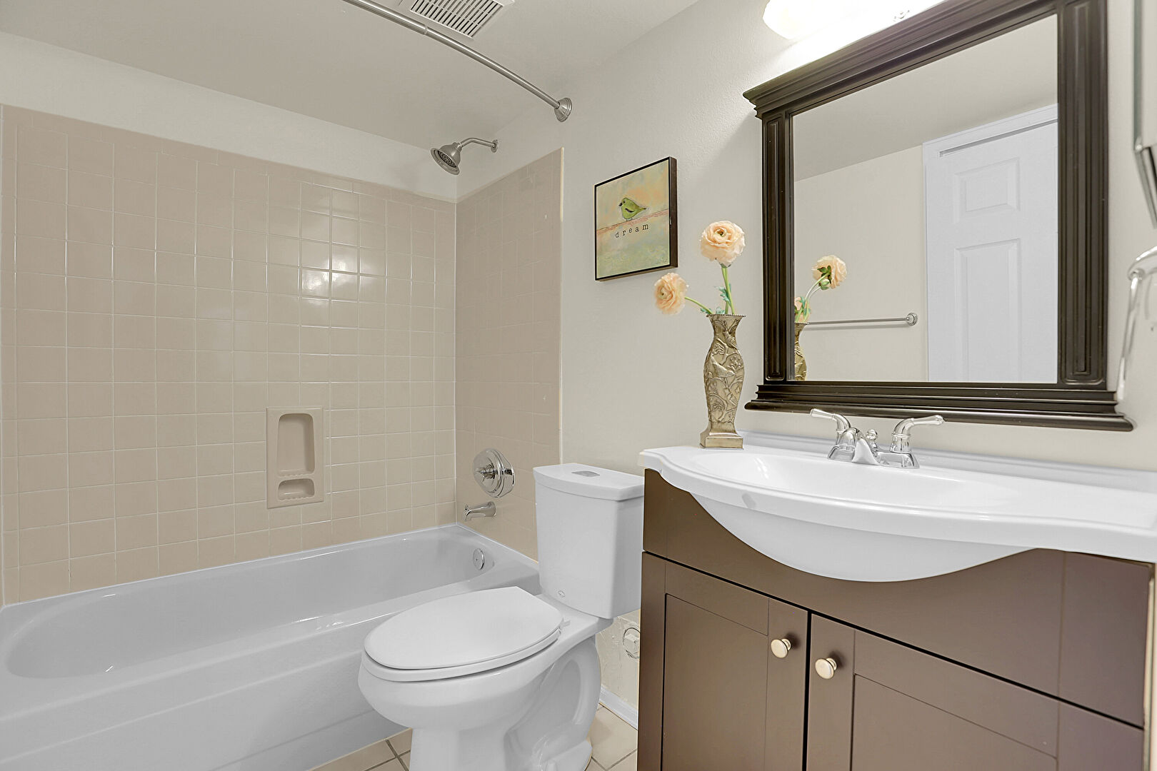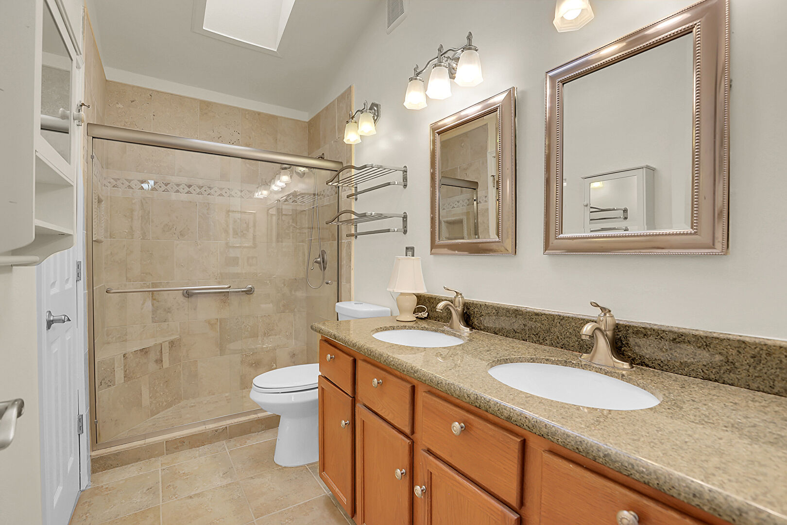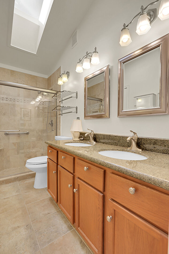 Combined Bath Shower, Double Vanity, Drywall, Full Bathroom, Tile Floor, Vanity, Vaulted Ceiling, Vent, Drywall, Full Bathroom, Skylight