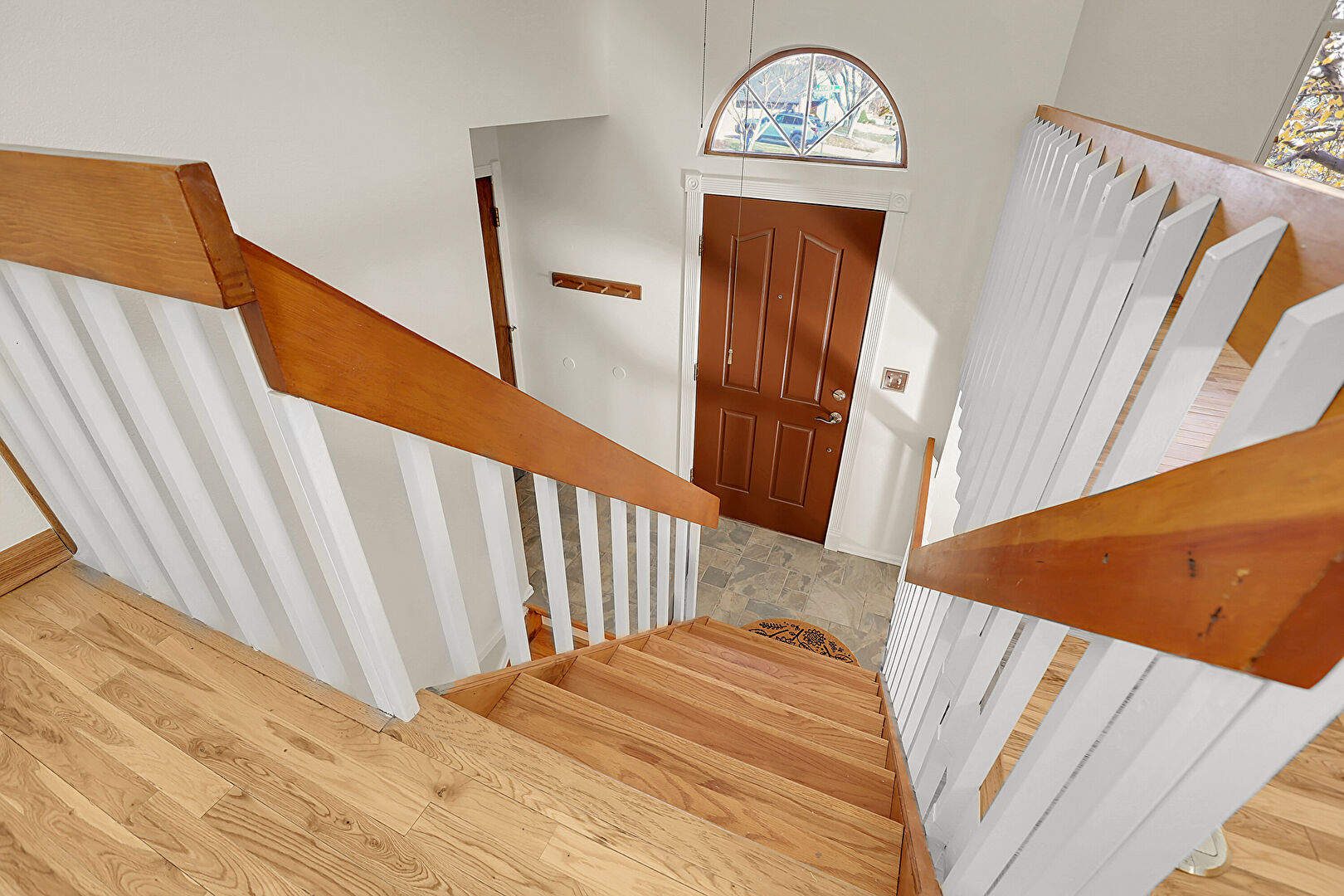 Drywall, Natural Light, Stairs, Wood Finish Floor, High Ceiling