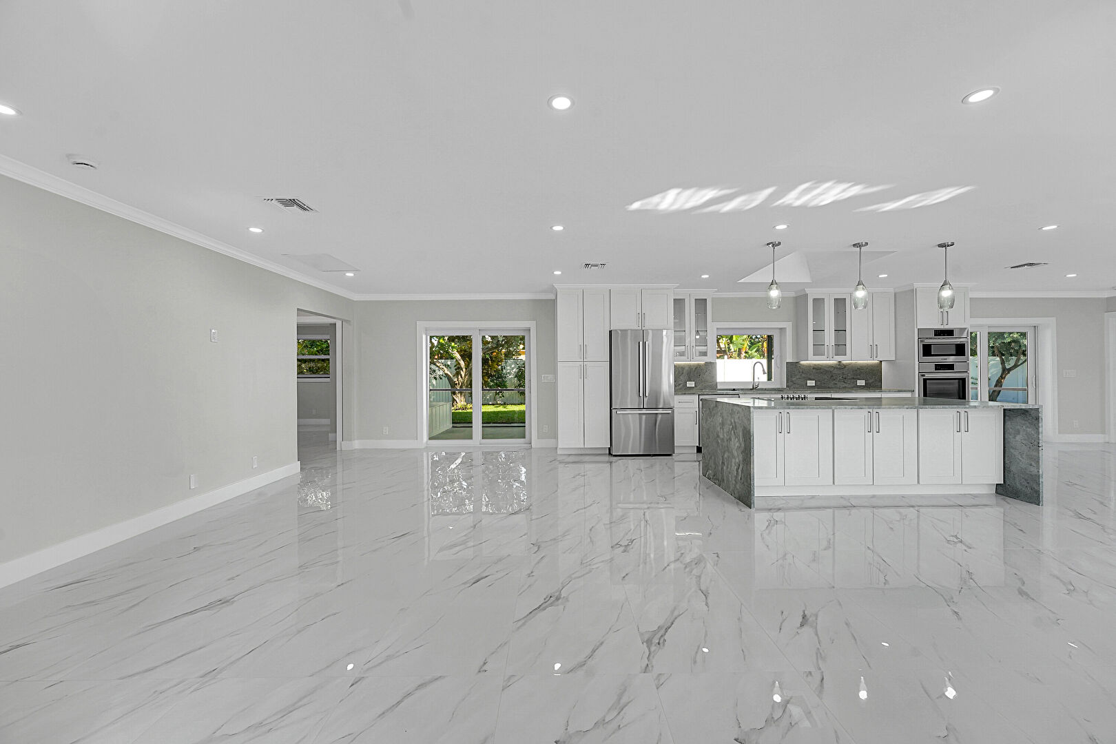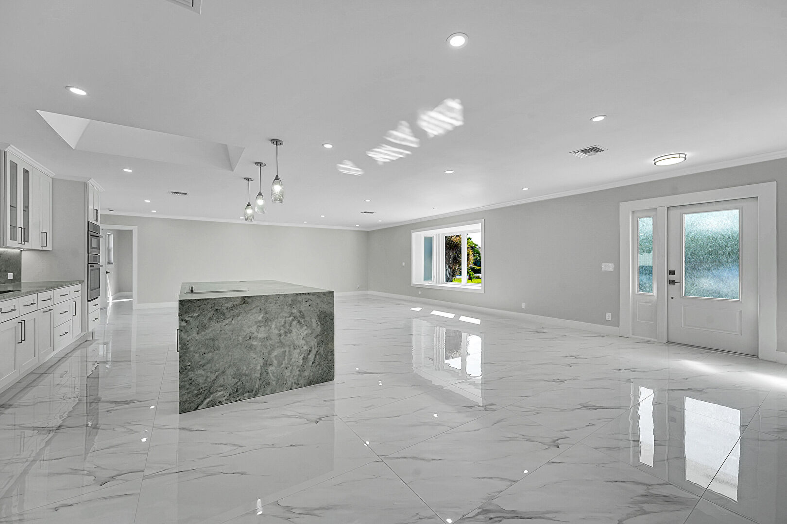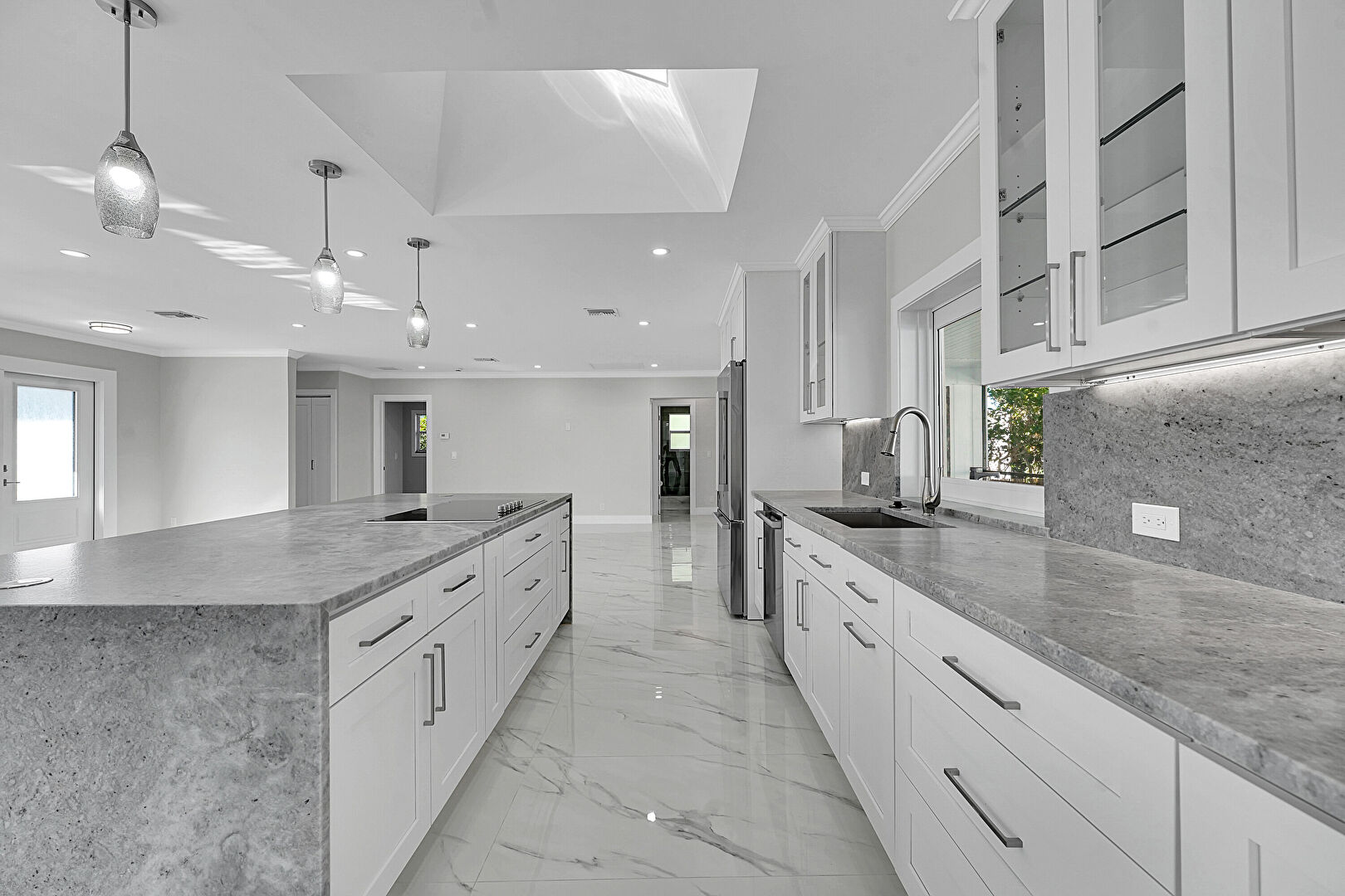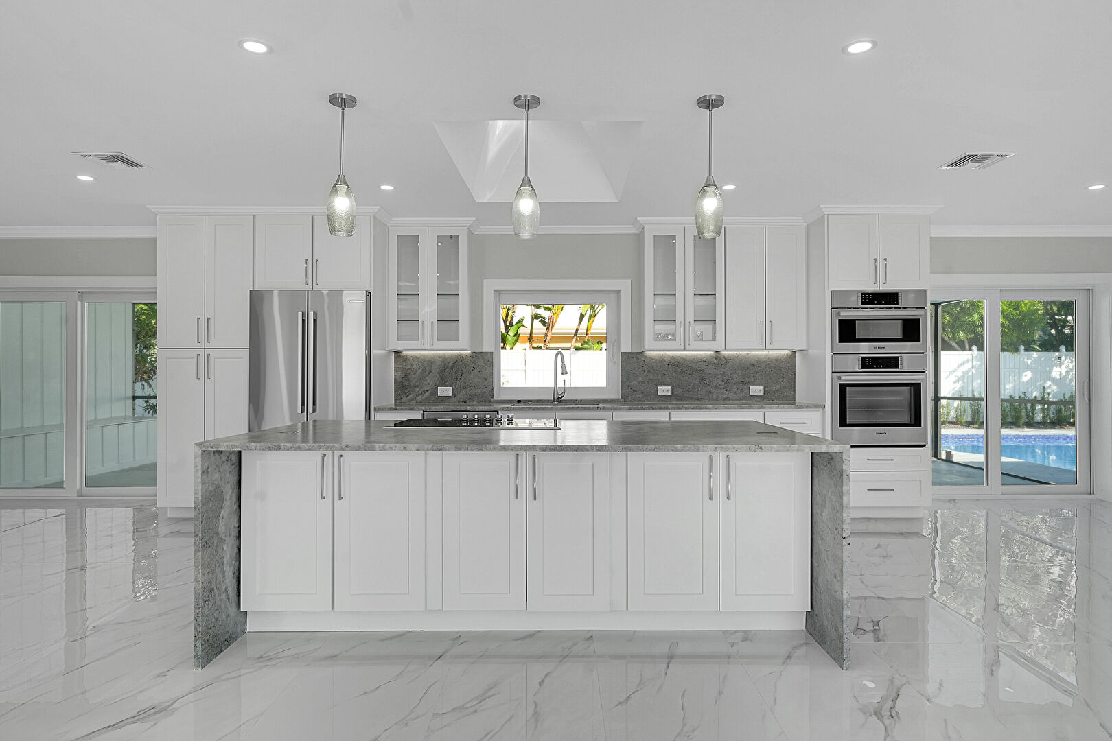 Baseboards Wall, Crown Molding, Crown Molding Cabinets, Double Oven, Drywall, Glass Insert Cabinets, Kitchen Island, Marble Finish Floor, Natural Light, One Wall Kitchen, Opens To Living Area, Pendant Lighting, Recessed Lighting, Shaker Cabinets, Stone Countertops, Vent, Crown Molding, Kitchen Island, Natural Light, Opens To Living Area, Vent