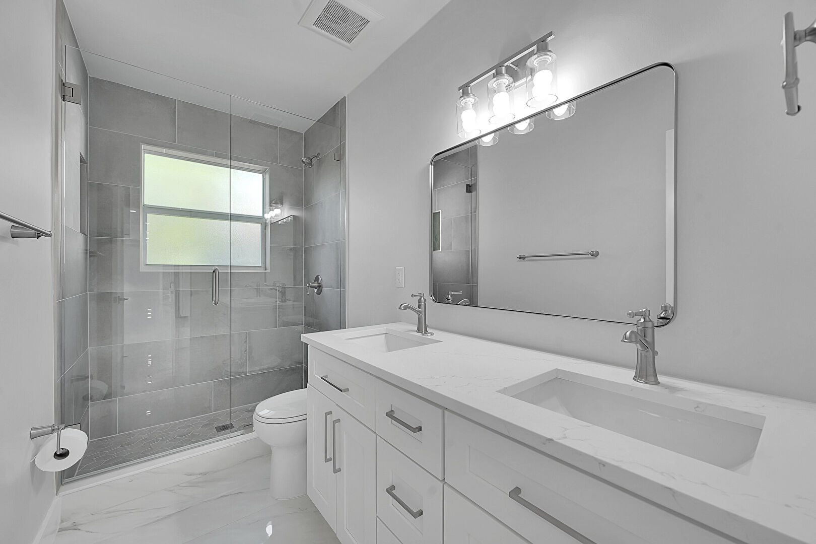 Drywall, Full Bathroom, Marble Finish Floor, Natural Light, Vent, Double Vanity