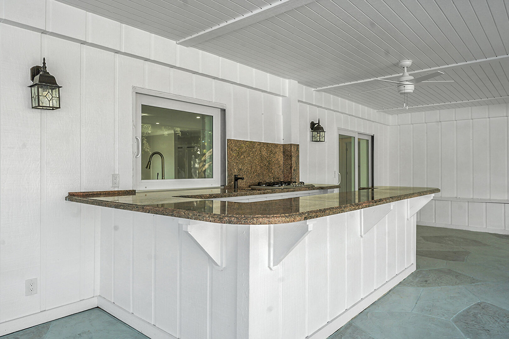 Ceiling Fan, Fence, Flat Panel Cabinets, Kitchen Bar, Kitchen Peninsula, Outdoor Kitchen, Stone Countertops, Sunroom, Tile Floor, Wood Ceiling, Ceiling Fan, Pool