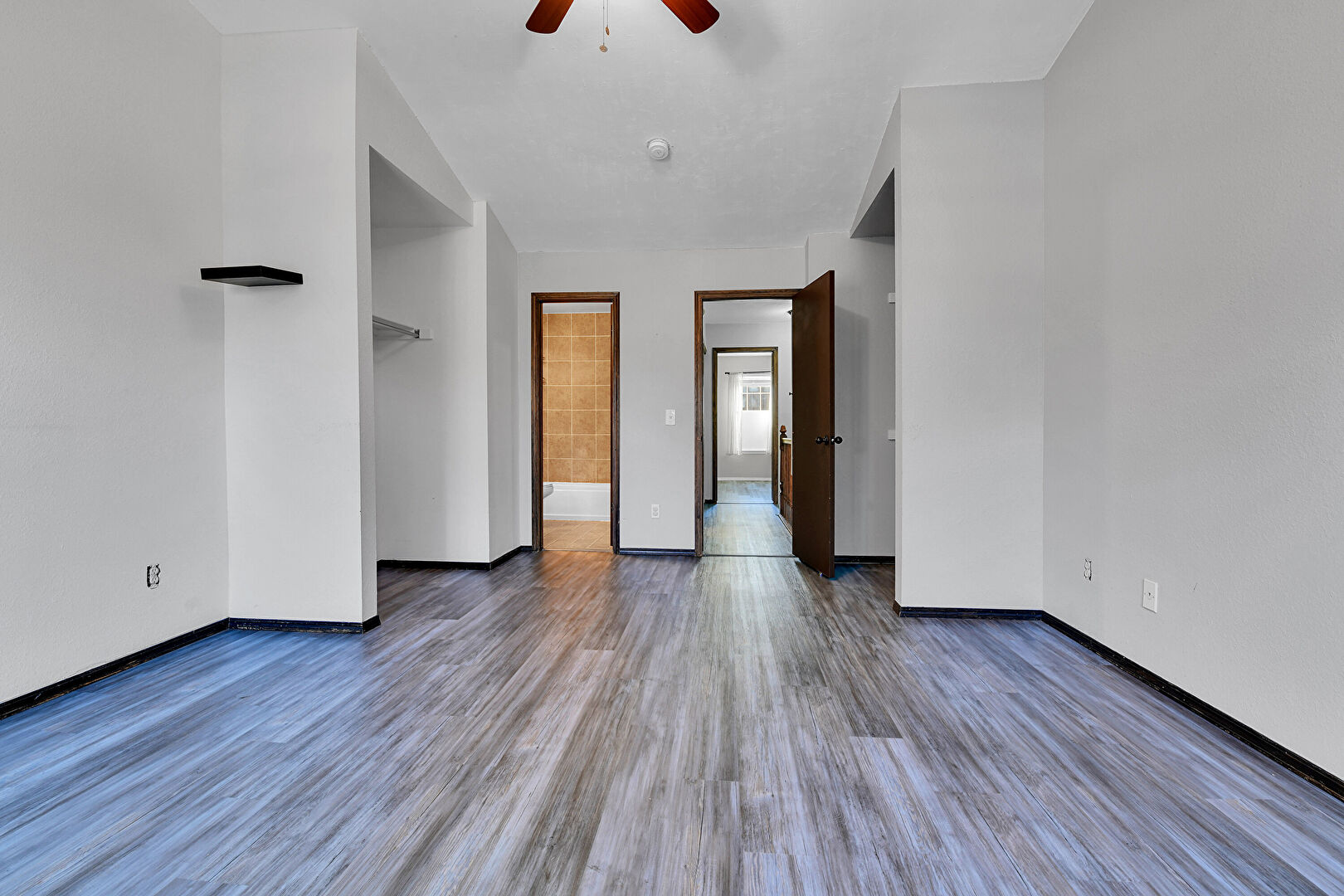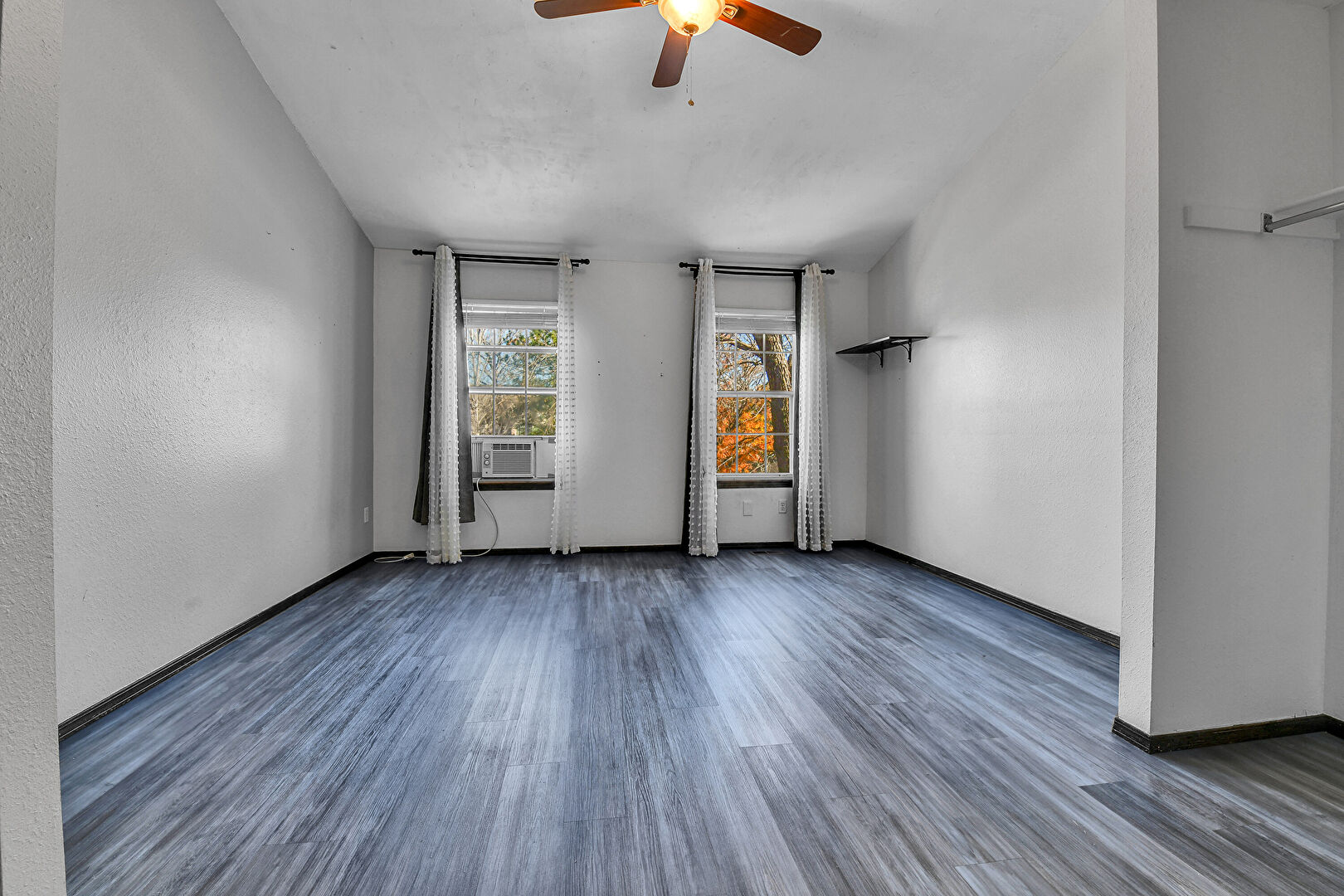 Baseboards Wall, Ceiling Fan, Drywall, Ensuite Bathroom, Natural Light, Window Mounted Ac, Wood Finish Floor, Textured Wall, Walk In Closet