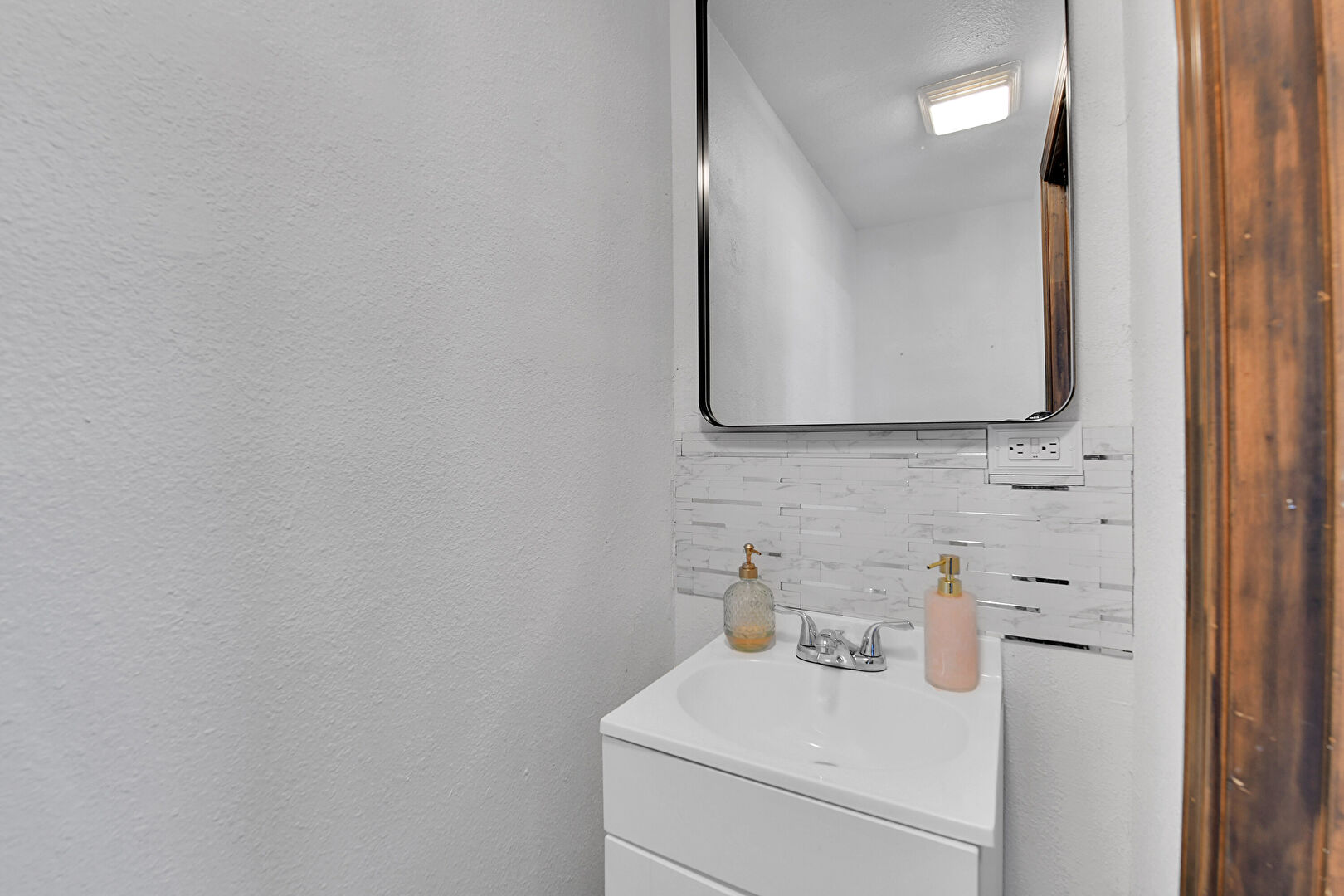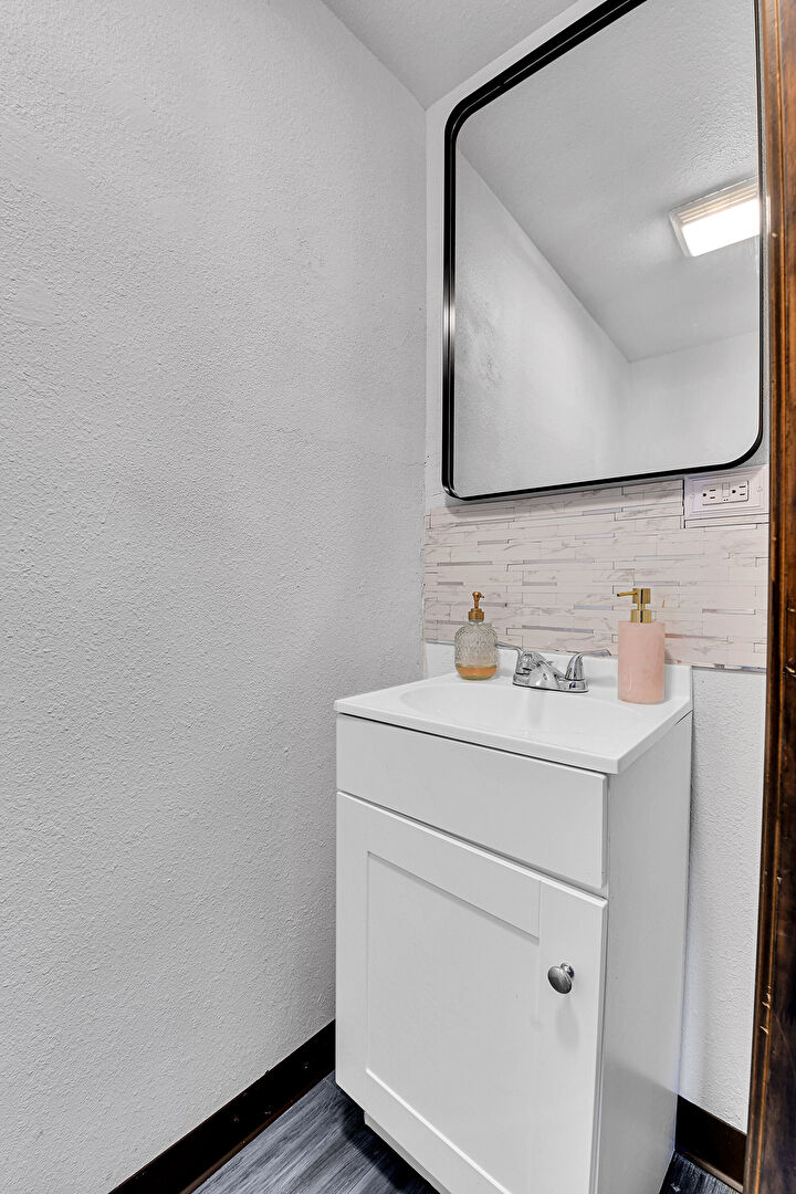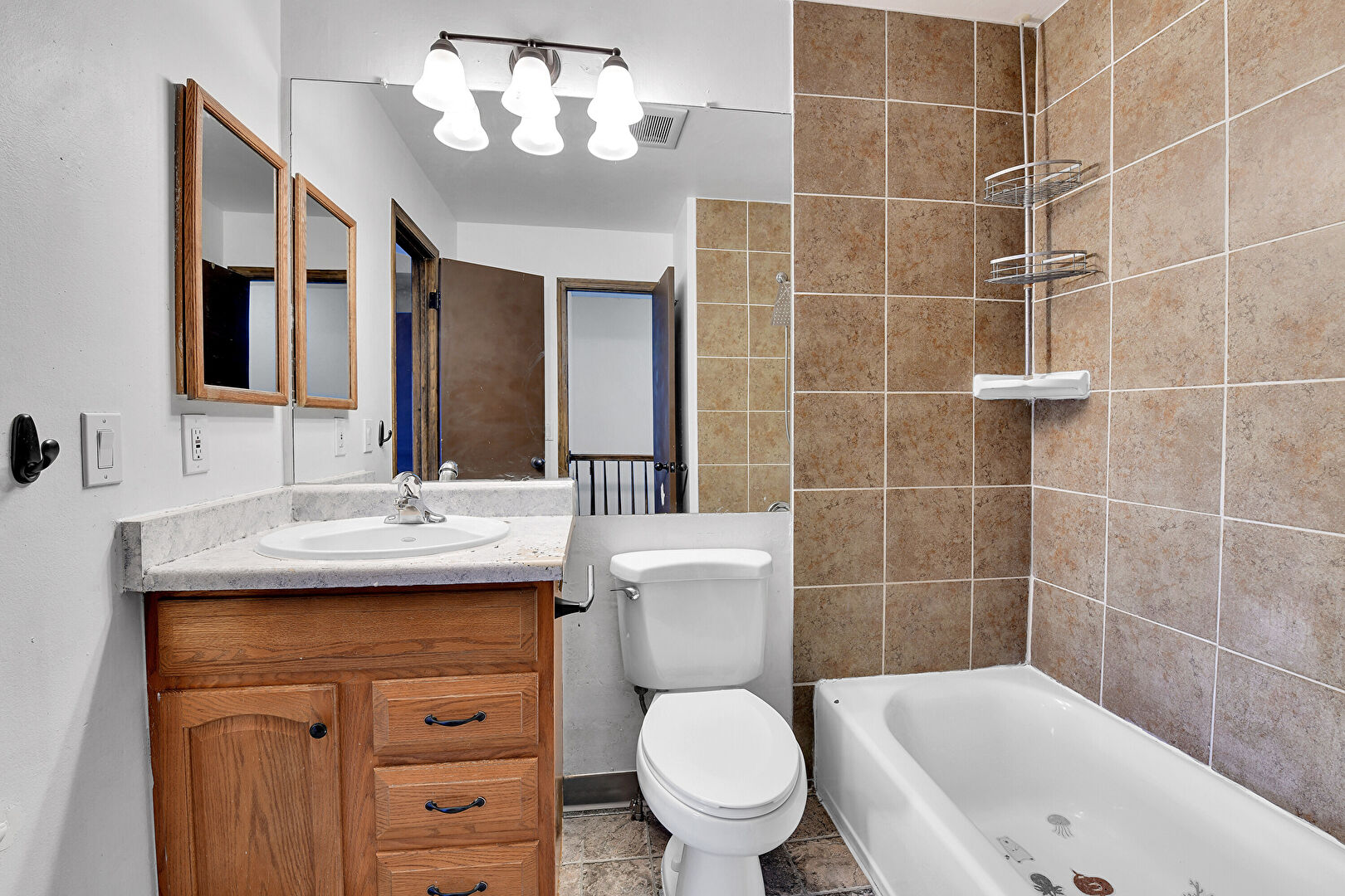 Drywall, Full Bathroom, Half Bathroom, Textured Wall, Tile Floor, Vanity, Vent, Wood Finish Floor, Baseboards Wall, Combined Bath Shower, Vanity