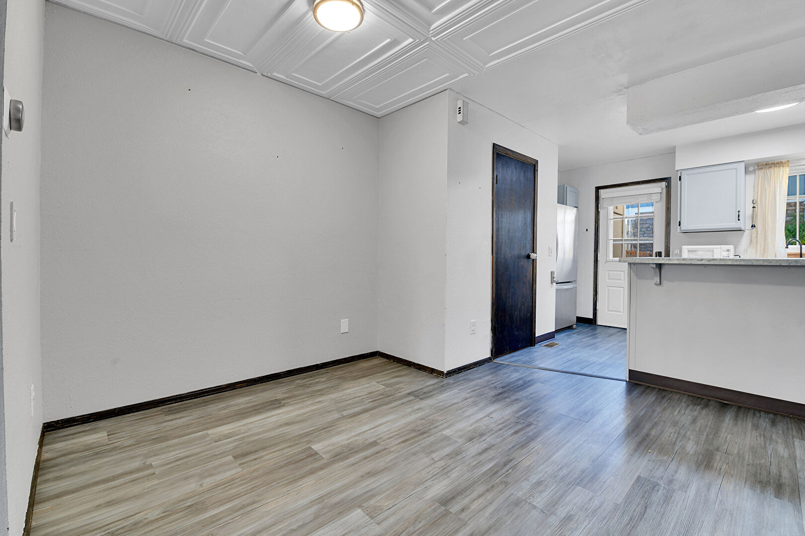 Baseboards Wall, Drywall, Kitchen Peninsula, Natural Light, Opens To Living Area, Shaker Cabinets, Tin Ceiling, Vent, Visible Hinge Cabinets, Wood Finish Floor, Drywall, Kitchen Bar