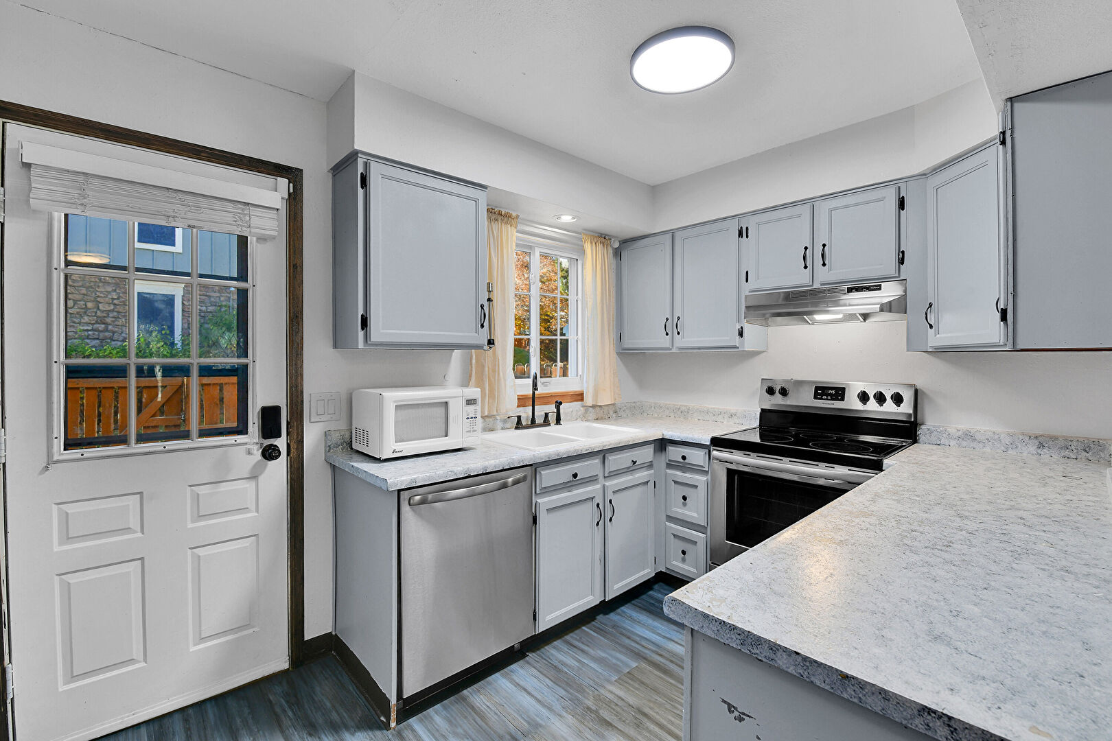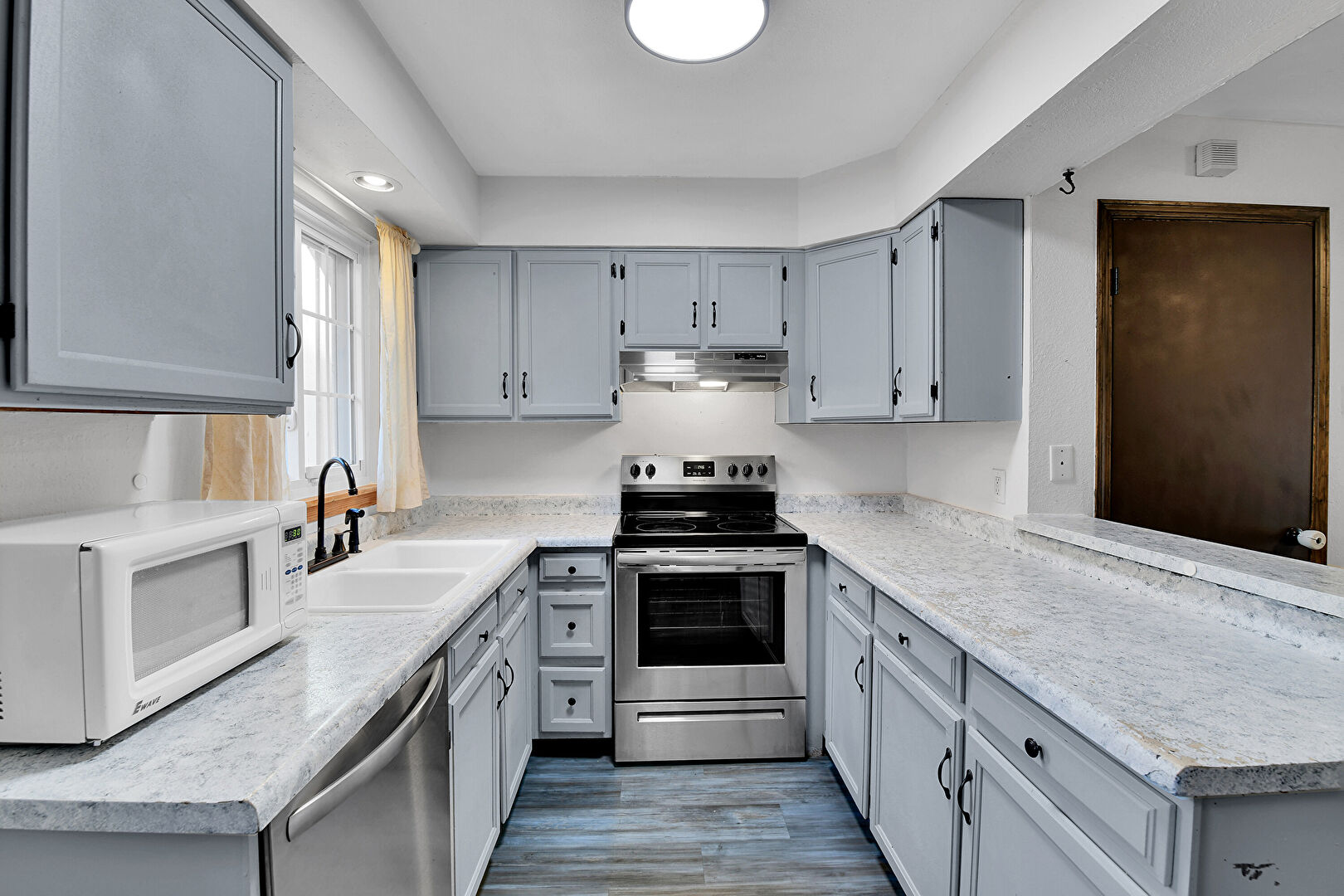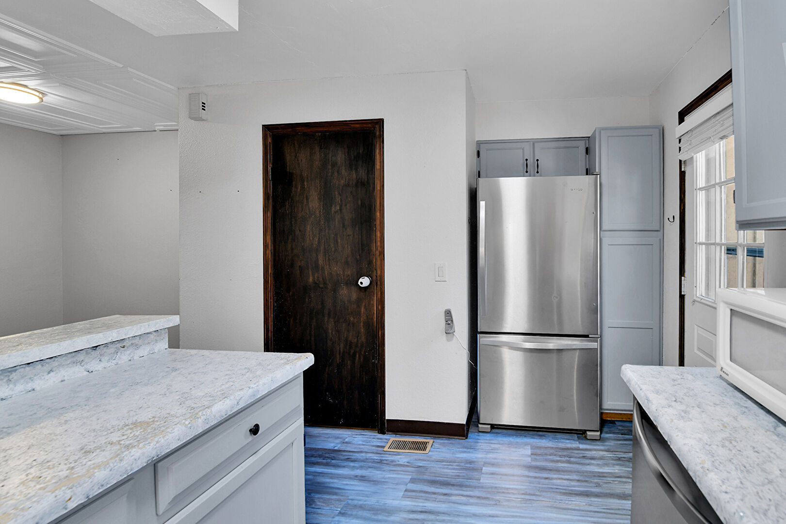 Baseboards Wall, Drywall, Gray Cabinets, Natural Light, Recessed Lighting, Shaker Cabinets, Stone Countertops, U Shaped Kitchen, Vent, Visible Hinge Cabinets, Wood Finish Floor, Drywall, Gray Cabinets, Shaker Cabinets