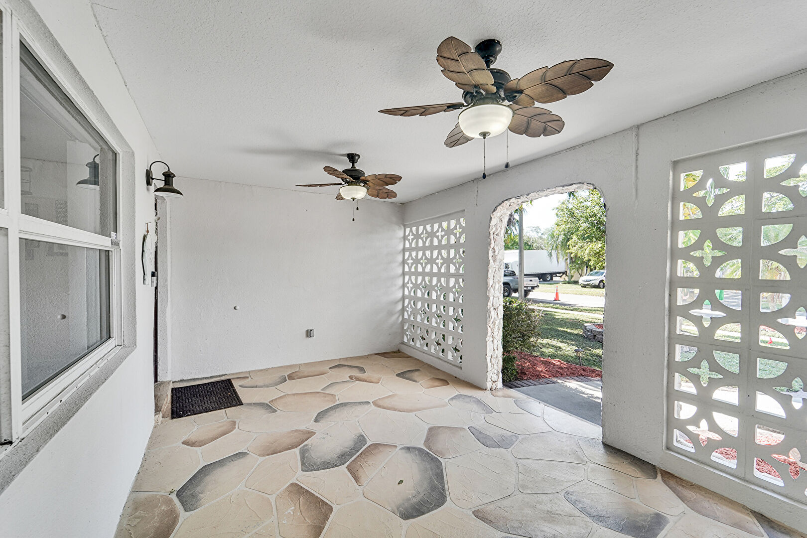 Ceiling Fan, Drywall, Natural Light, Stone Finish Floor, Sunroom, Textured Ceiling