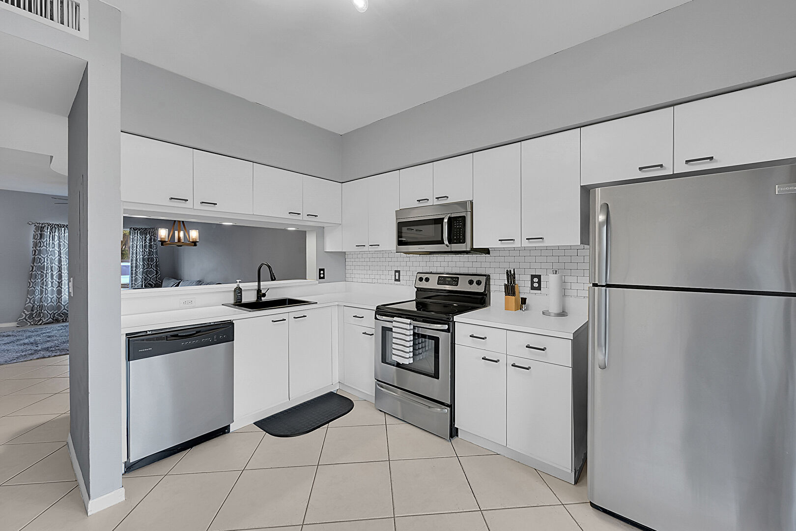 Baseboards Wall, Drywall, Flat Panel Cabinets, Kitchen Bar, L Shaped Kitchen, Natural Light, Notable Chandelier, Pass Through Window, Tile Floor, Vent, Drywall, Kitchen Peninsula, Natural Light