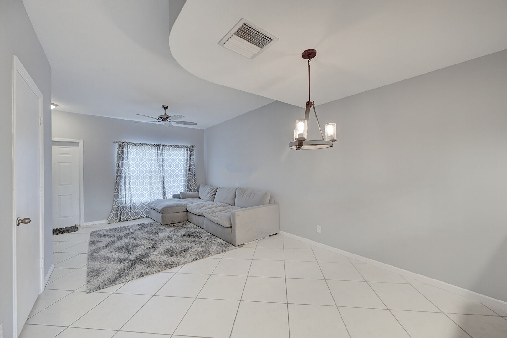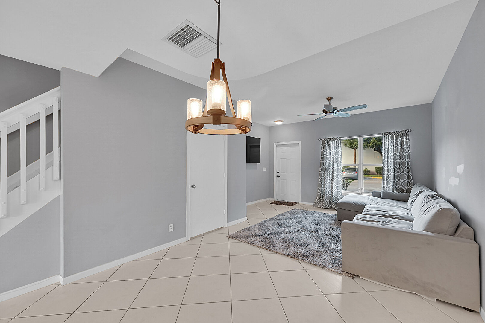 Baseboards Wall, Ceiling Fan, Drywall, Natural Light, Notable Chandelier, Tile Floor, Vaulted Ceiling, Vent, Baseboards Wall, Drywall, Tile Floor, Vent