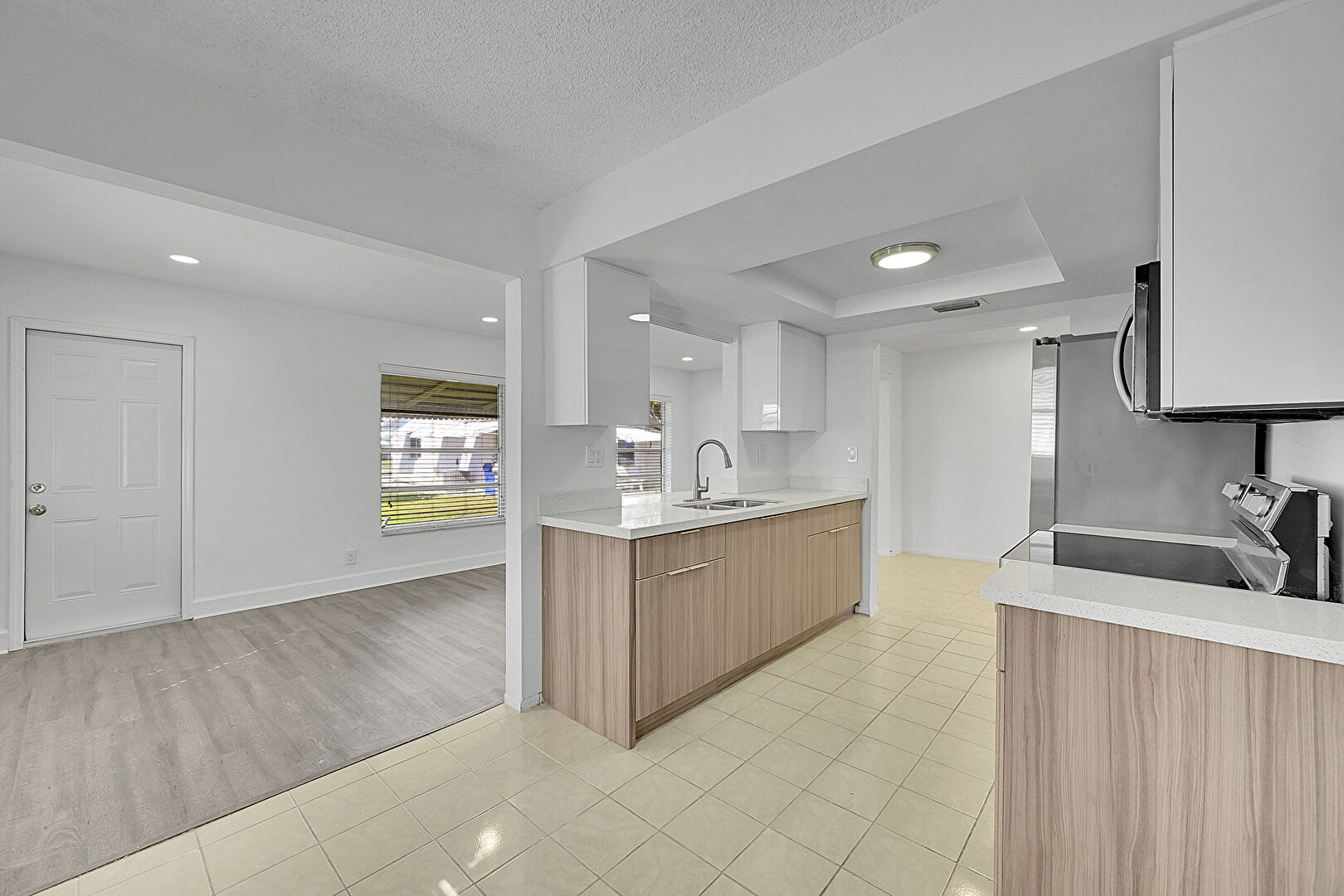 Baseboards Wall, Drywall, Flat Panel Cabinets, Kitchen Peninsula, Natural Light, Pass Through Window, Recessed Lighting, Stone Countertops, Tile Floor, Tray Ceiling, Drywall, Stone Countertops