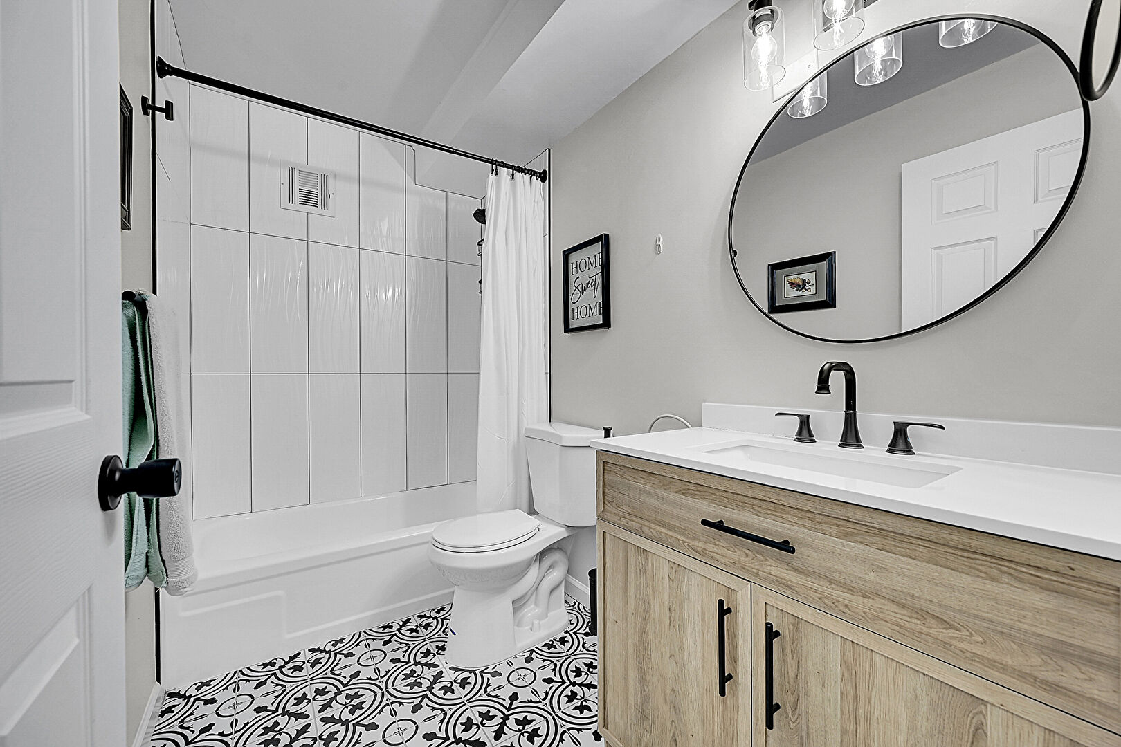 Drywall, Full Bathroom, Tile Floor, Vanity, Vent, Combined Bath Shower