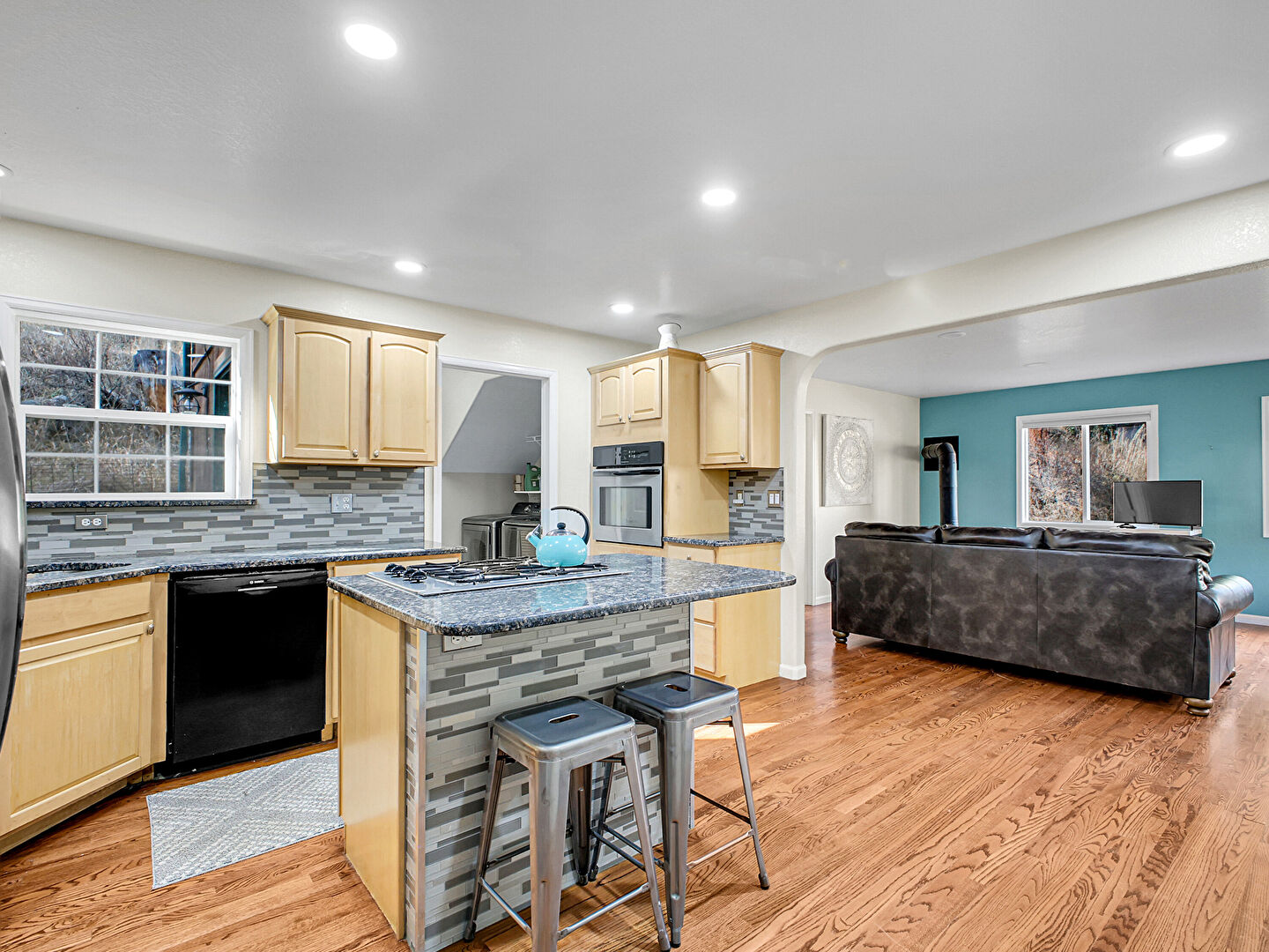 Arched Cabinets, Baseboards Wall, Crown Molding Cabinets, Drywall, Kitchen Bar, Kitchen Island, Natural Light, Open Shelves, Opens To Living Area, Raised Cabinets, Recessed Lighting, Stone Countertops, U Shaped Kitchen, Wood Finish Floor, Arched Cabinets, Crown Molding Cabinets, Recessed Lighting