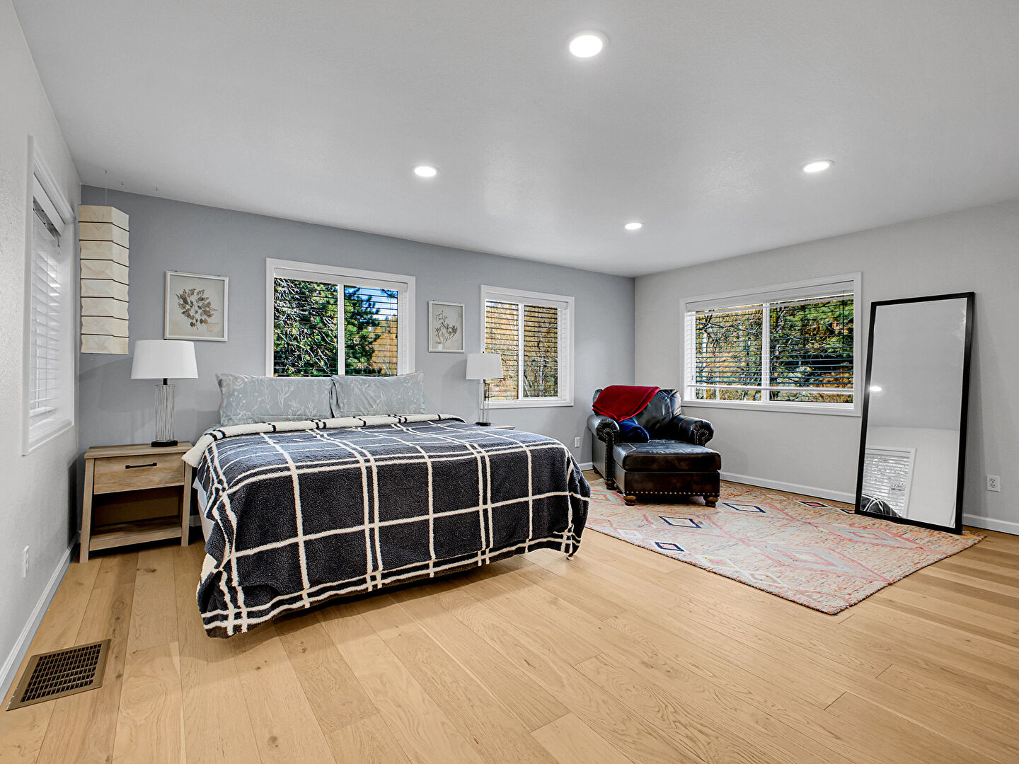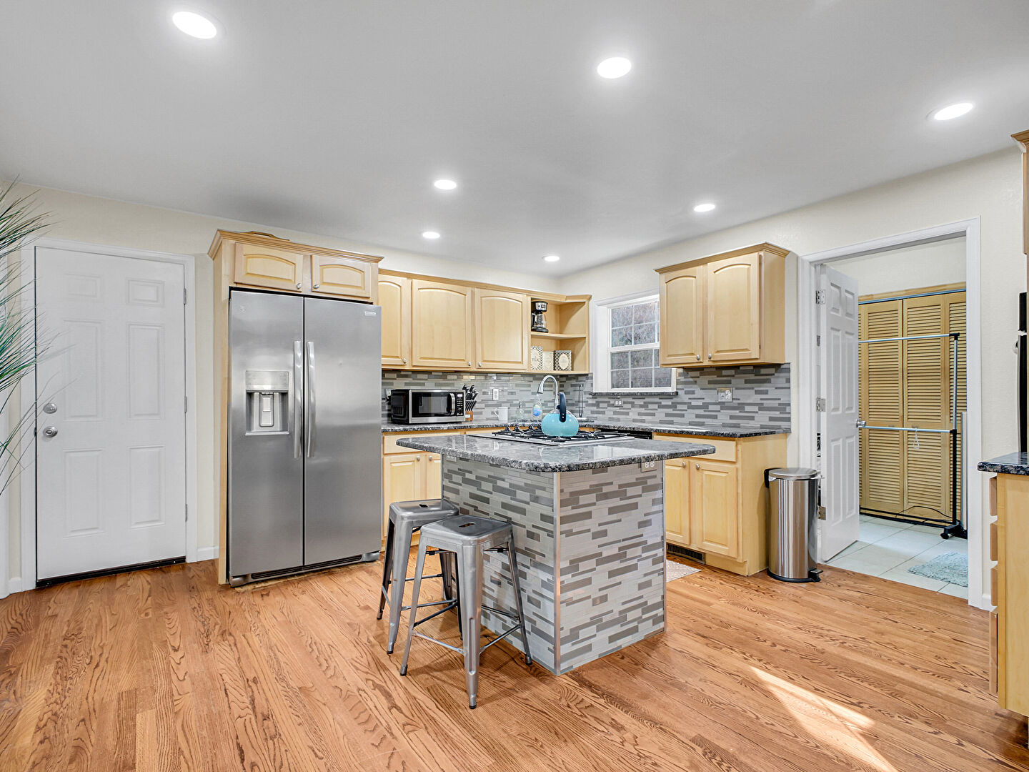 Built In Desk, Drywall, Indoor Bar, Natural Light, Recessed Lighting, Textured Wall, Vent, Wood Finish Floor, Baseboards Wall