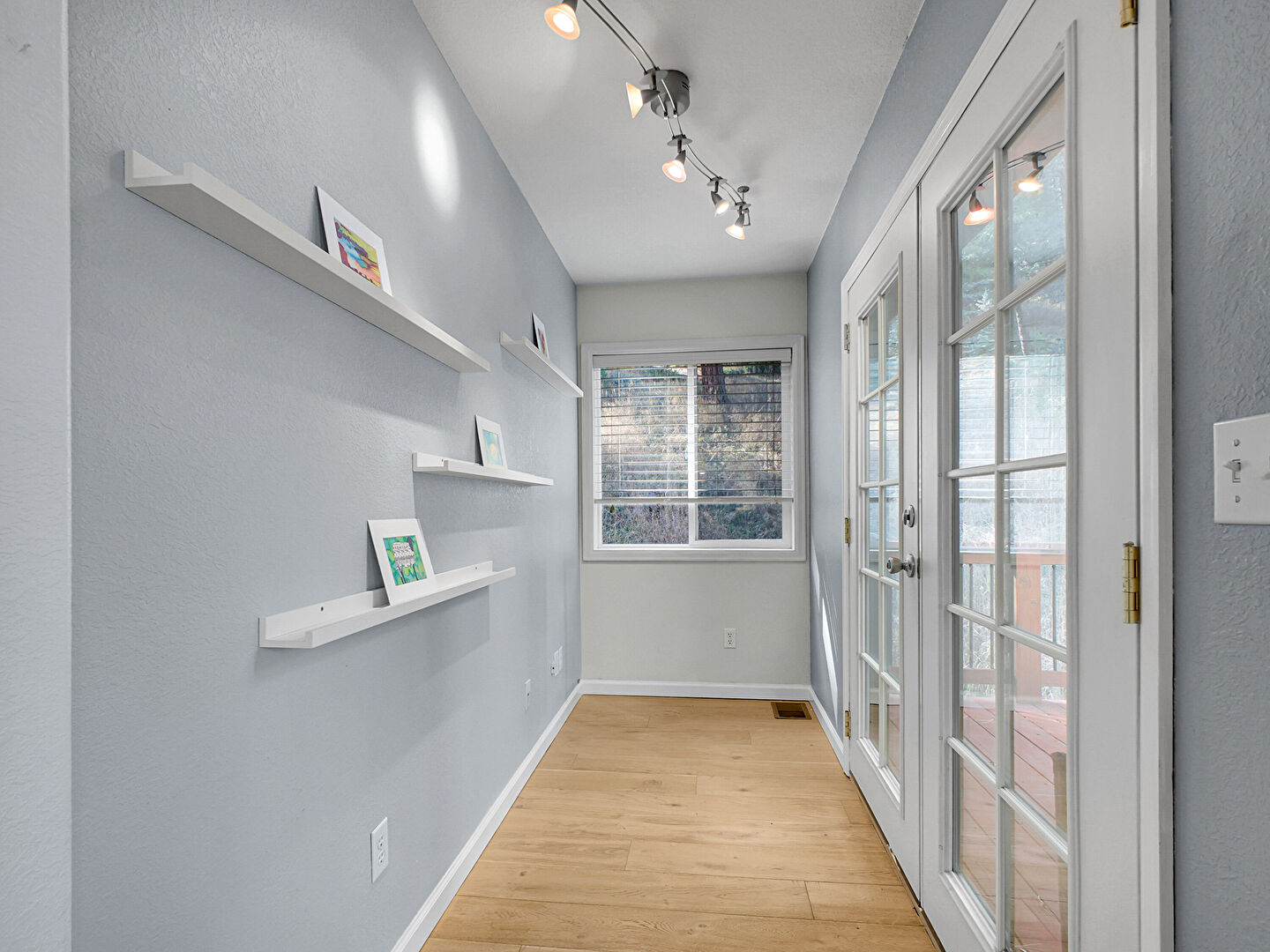 Baseboards Wall, Natural Light, Textured Wall, Track Lighting, Wood Finish Floor, French Doors