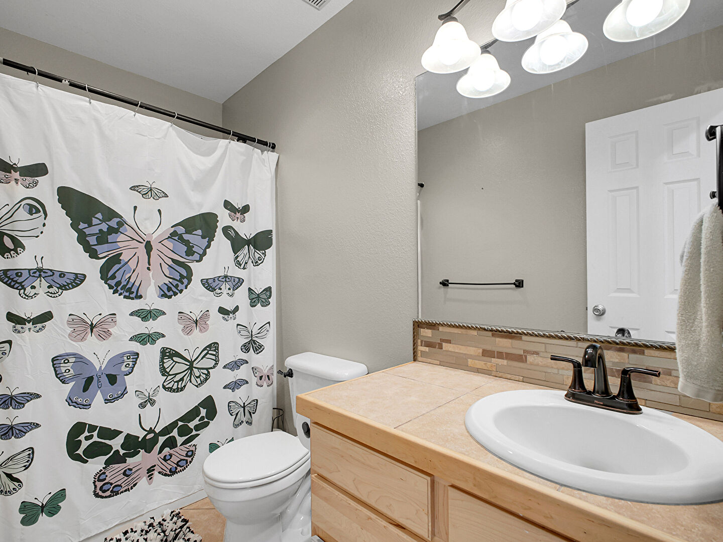 Baseboards Wall, Combined Bath Shower, Drywall, Full Bathroom, Notable Chandelier, Recessed Lighting, Tile Floor, Vanity, Vent, Full Bathroom, Half Bathroom, Natural Light, Tile Floor