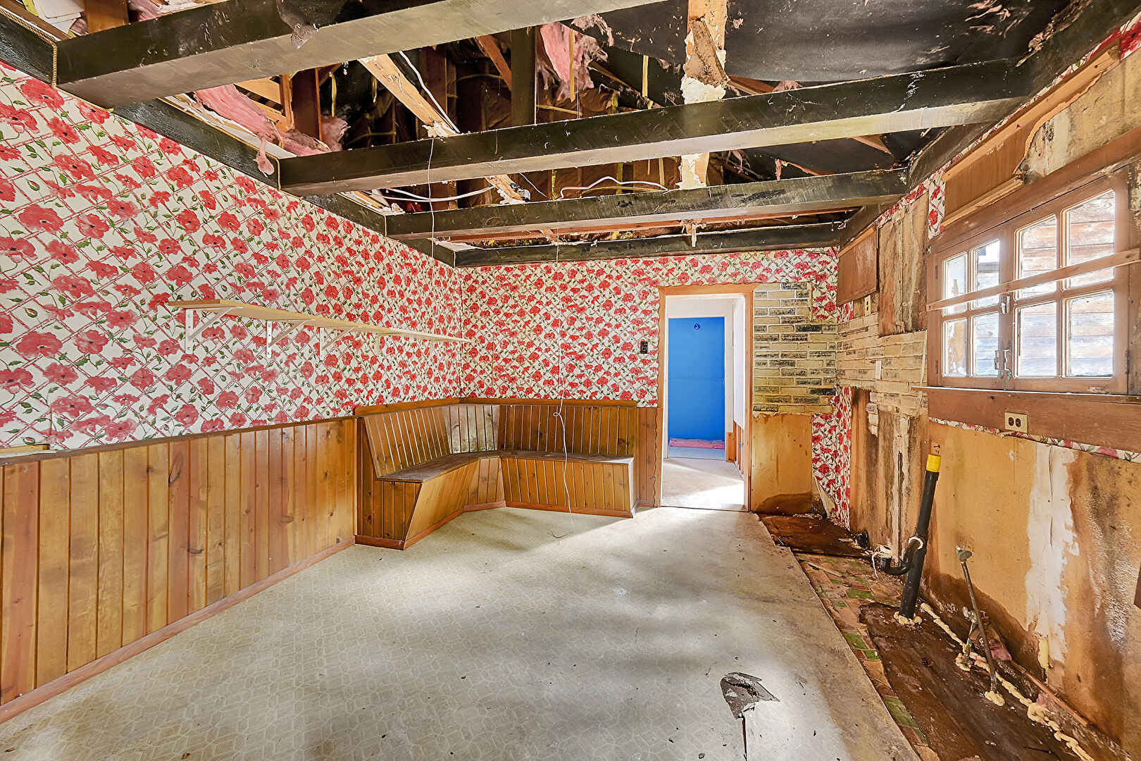 Beamed Ceiling, Carpet, Natural Light, Wood Ceiling, Wood Stove, Wood Wall, Notable Chandelier