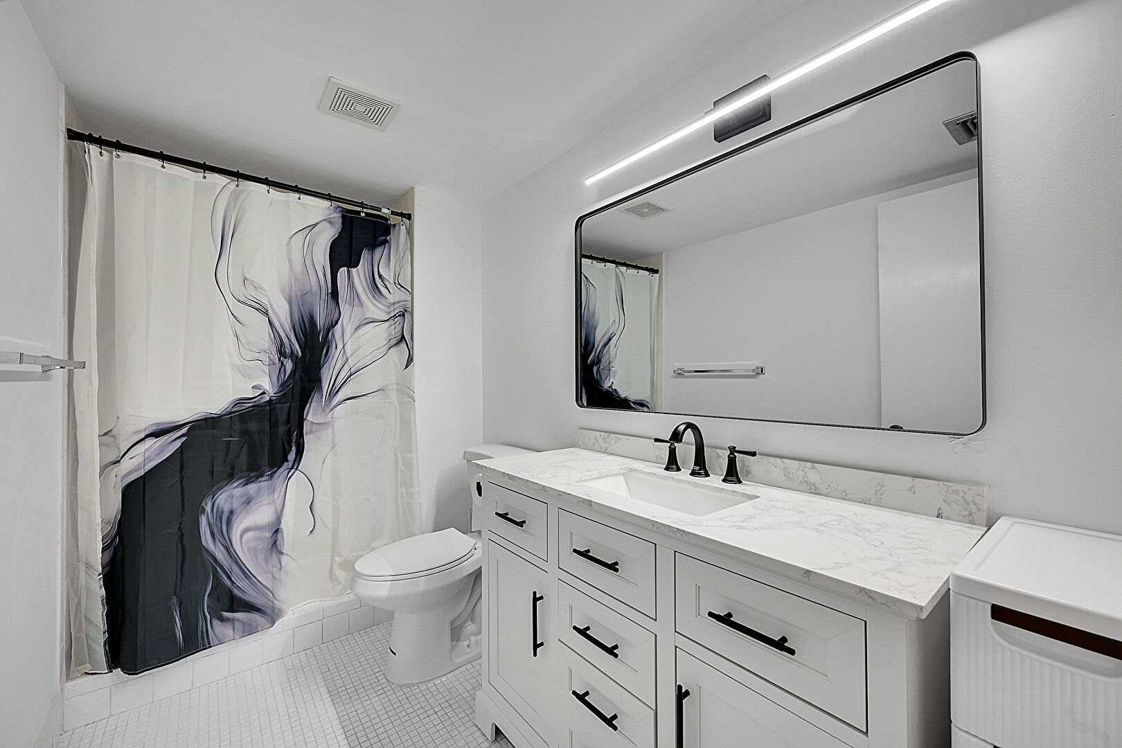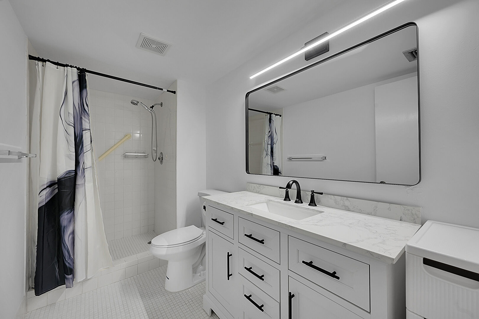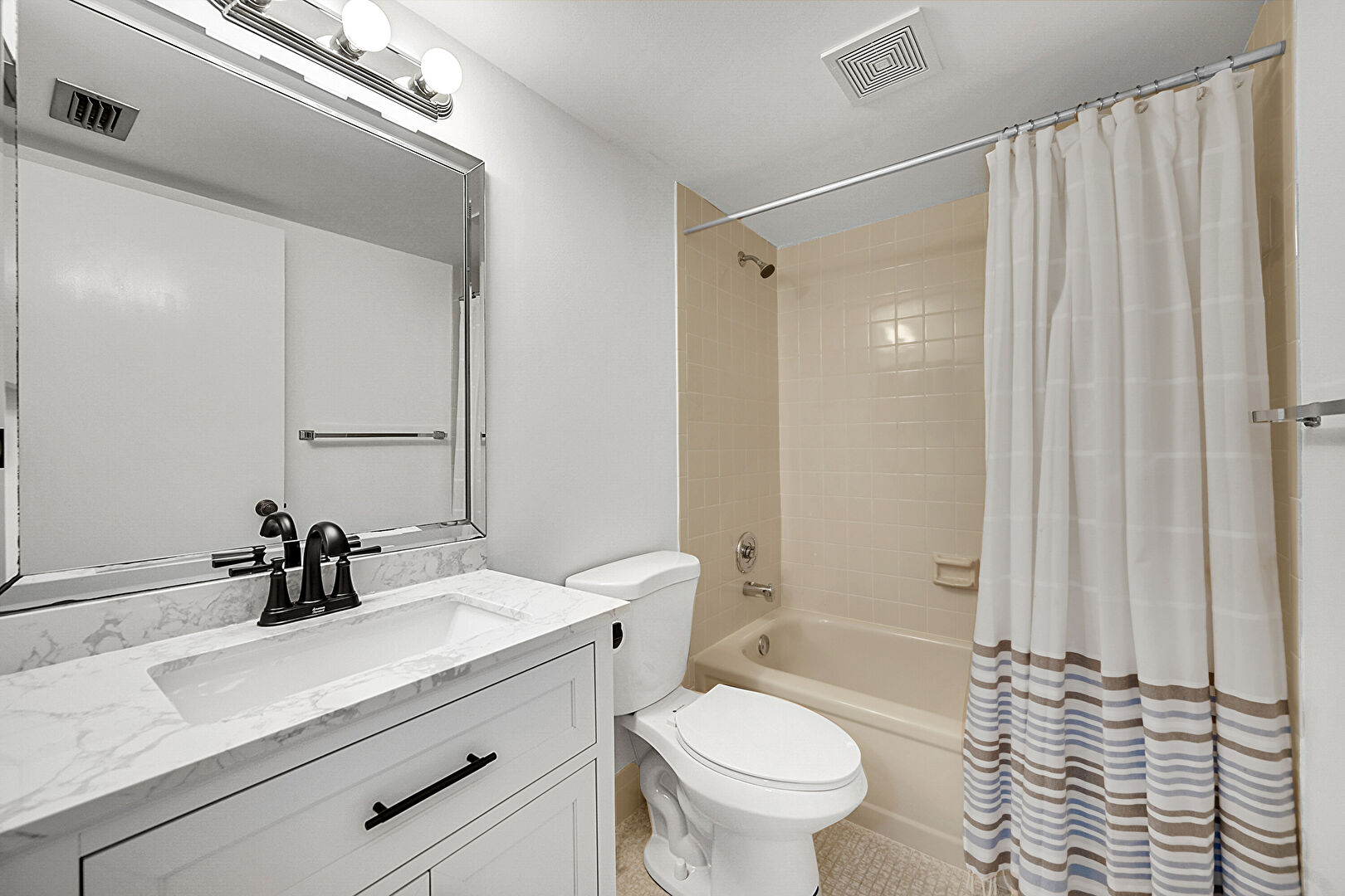 Combined Bath Shower, Full Bathroom, Tile Floor, Vanity, Vent, Drywall