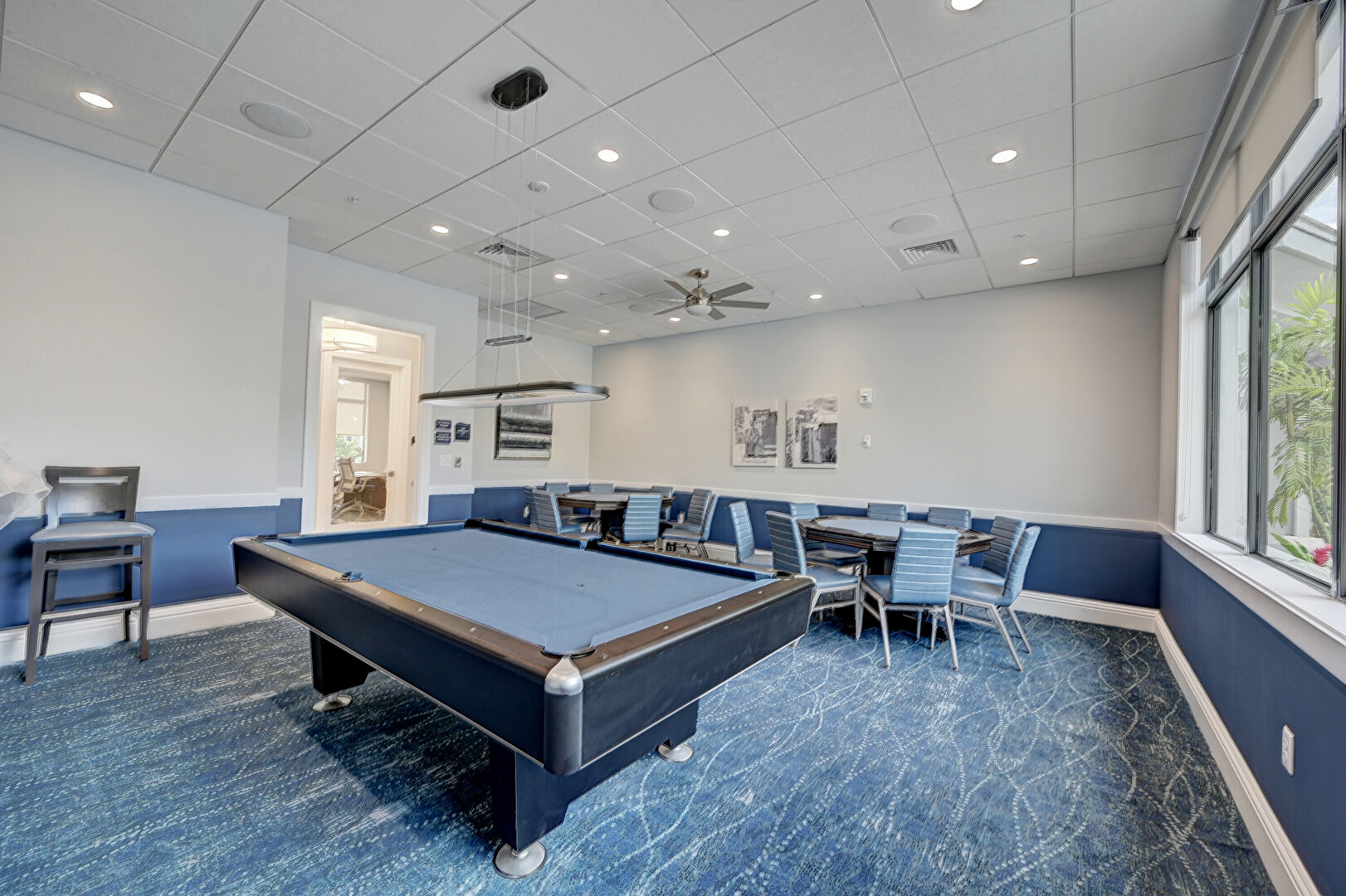 Baseboards Wall, Billiards, Carpet, Ceiling Fan, Drywall, Fence, Handrail, High Ceiling, Library, Marble Finish Floor, Notable Chandelier, Pool, Recessed Lighting, Vent, Natural Light, Patio, Residential View, Shuffleboard, Tray Ceiling, Vent