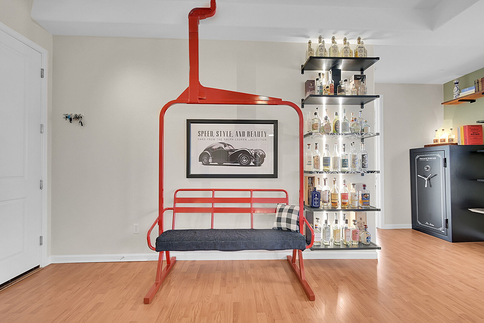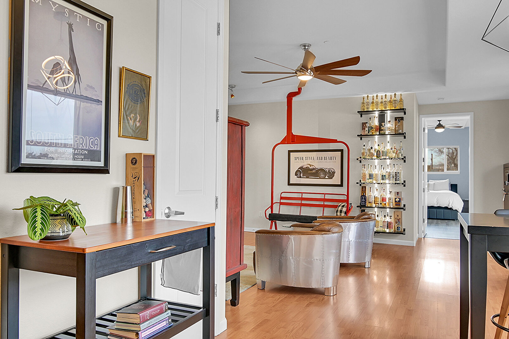 Barn Door, Baseboards Wall, Ceiling Fan, Drywall, Fireplace, Natural Light, Open Shelves, Track Lighting, Tray Ceiling, Vent, Wood Finish Floor, Baseboards Wall, Ceiling Fan, Drywall, Vent, Wood Finish Floor