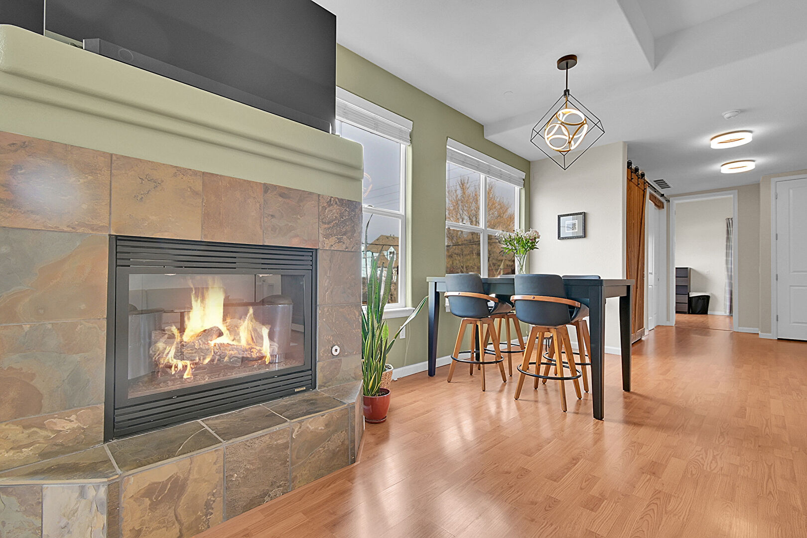 Barn Door, Baseboards Wall, Drywall, Fireplace, Natural Light, Wood Finish Floor, Baseboards Wall, Natural Light