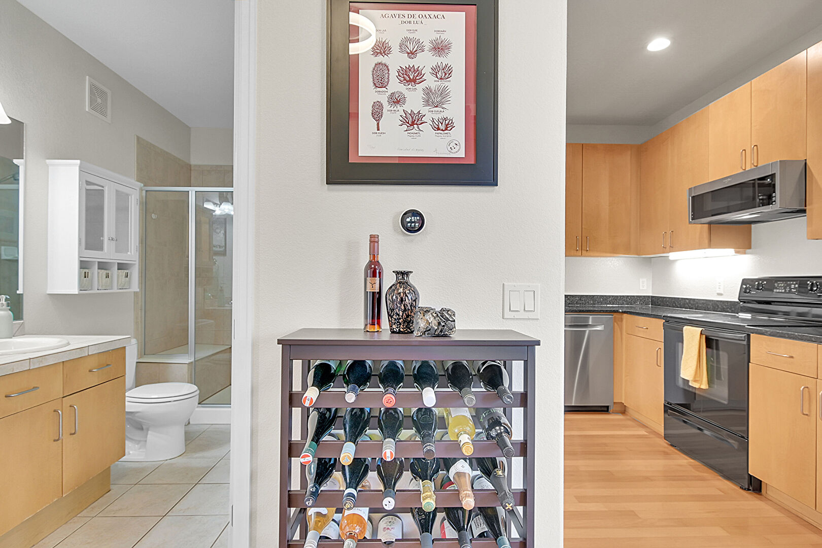 Barn Door, Baseboards Wall, Drywall, Flat Panel Cabinets, Natural Light, Open Shelves, Recessed Lighting, Stone Countertops, Vent, Wood Finish Floor, Stone Countertops, Tile Floor, Wood Finish Floor