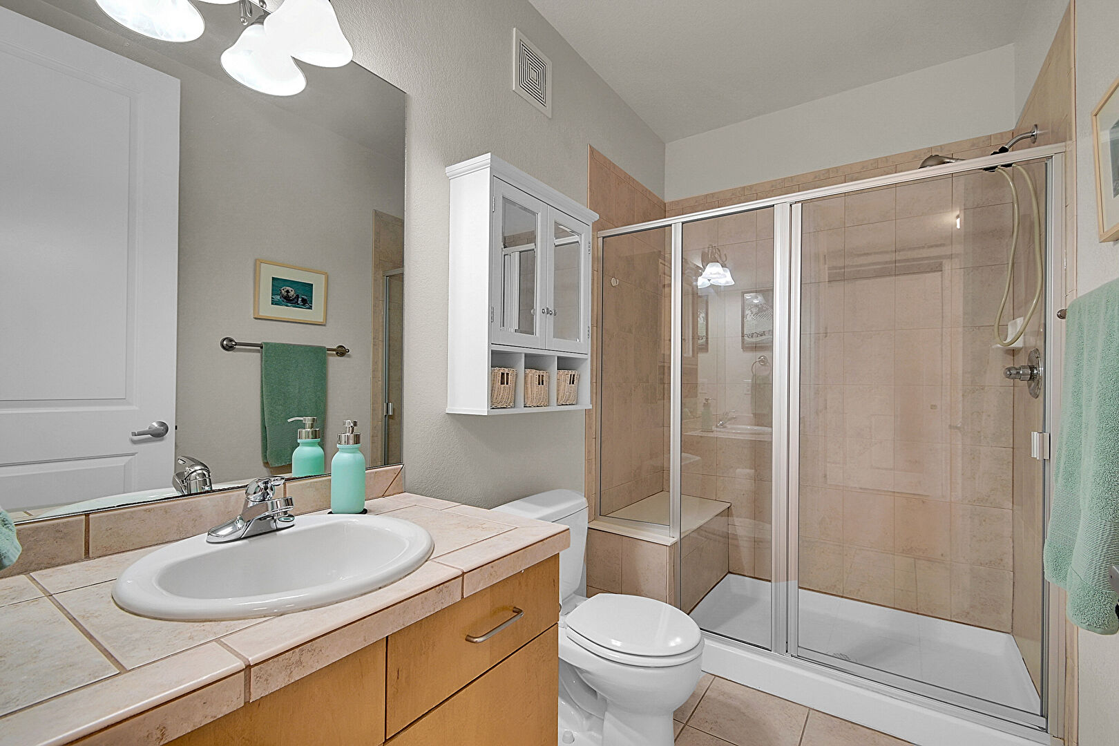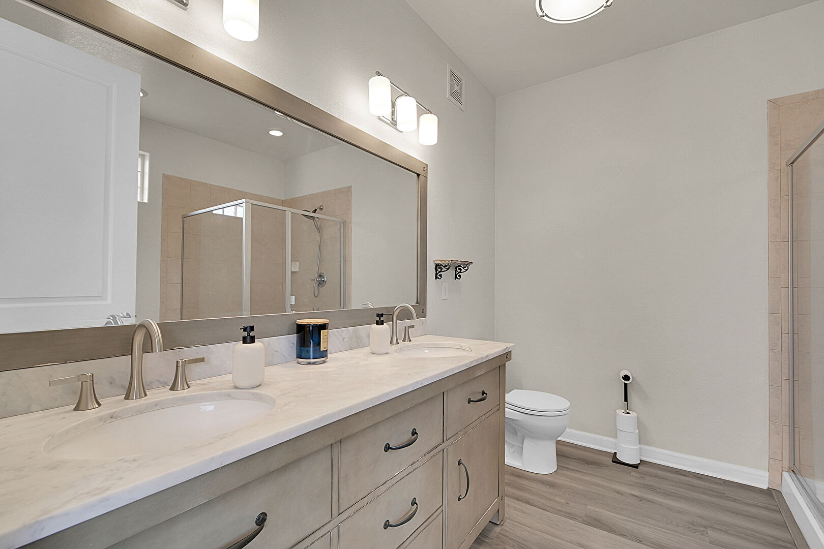 Baseboards Wall, Ceiling Fan, Double Vanity, Drywall, Ensuite Bathroom, Full Bathroom, Natural Light, Recessed Lighting, Tile Floor, Vanity, Vent, Wood Finish Floor, Full Bathroom, Vent, Wood Finish Floor