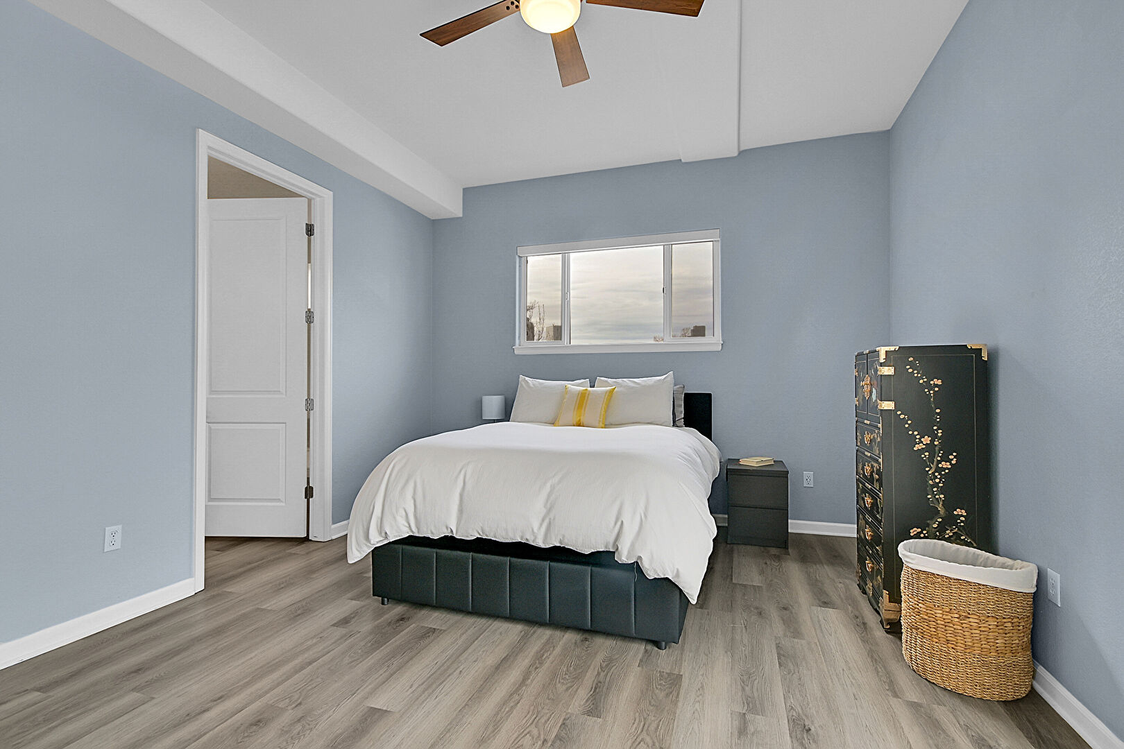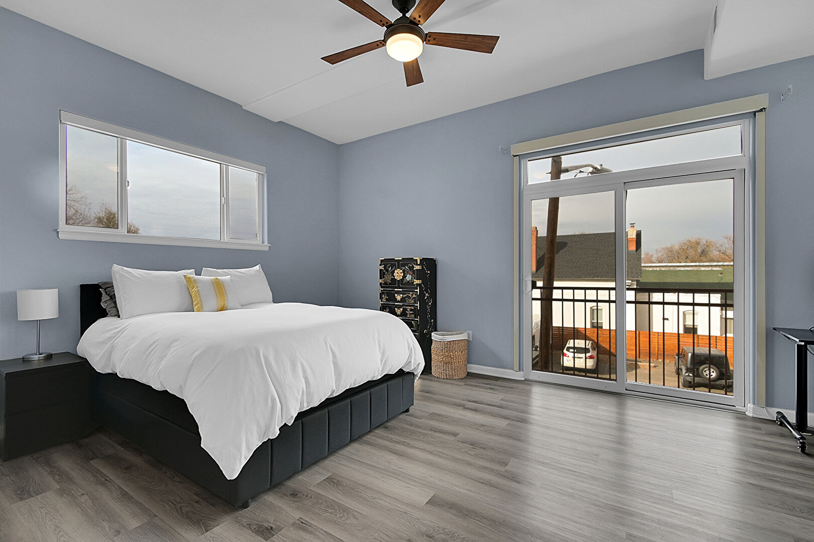 Access To Exterior, Baseboards Wall, Ceiling Fan, Drywall, Natural Light, Vent, Wood Finish Floor, Drywall, Natural Light, Office Area