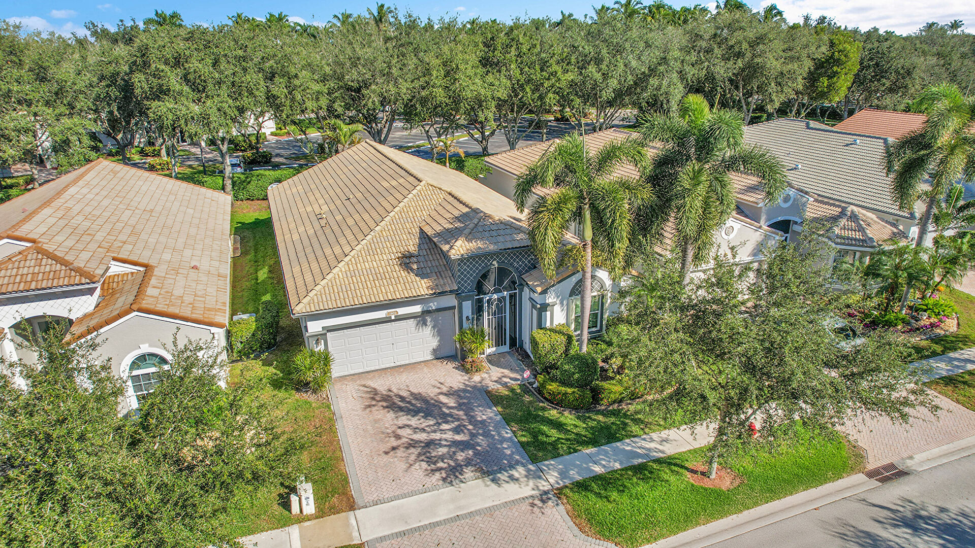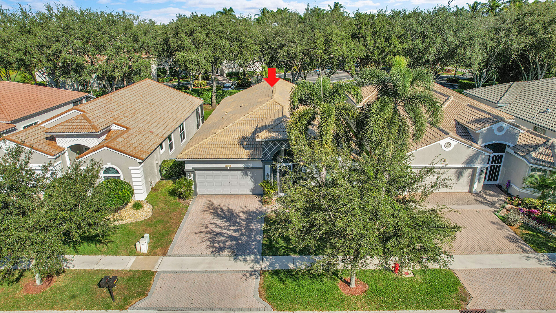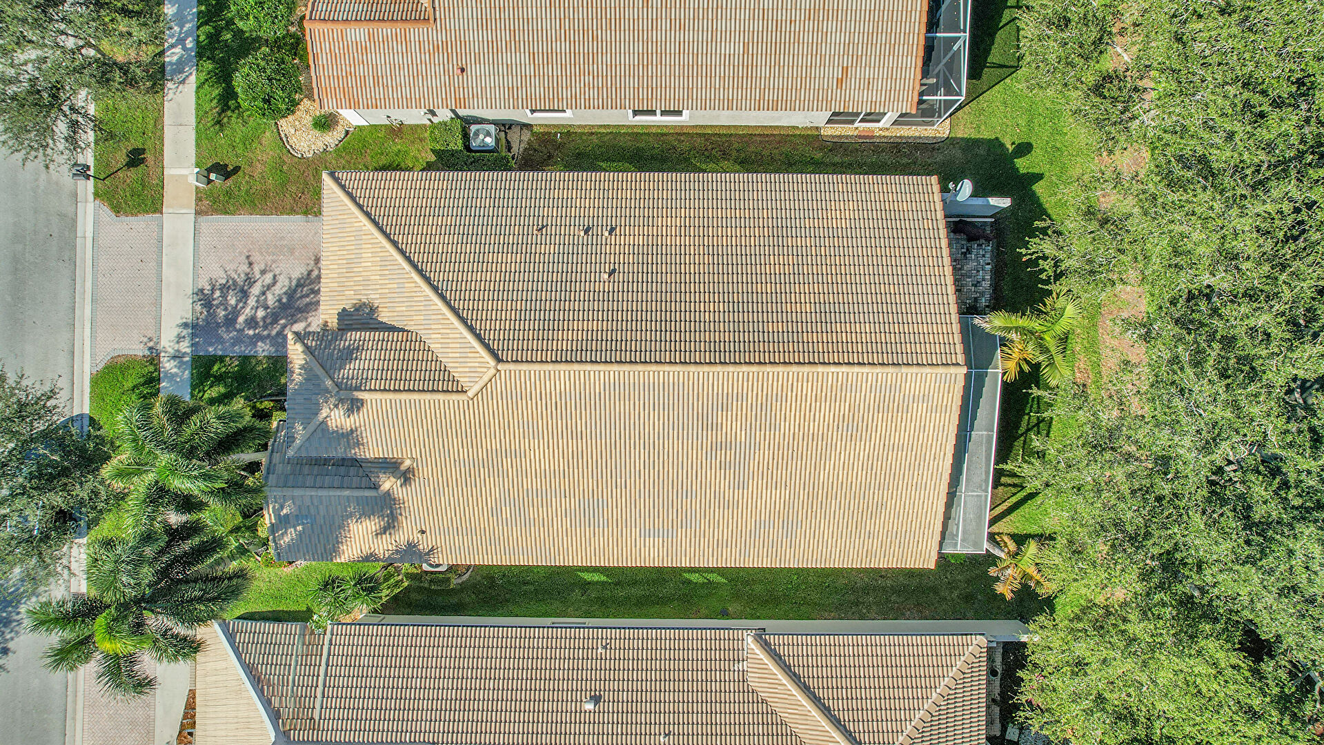 Downspout, Driveway, Lawn, Stucco Siding, Tile Roof, Driveway, Gutters, Tile Roof