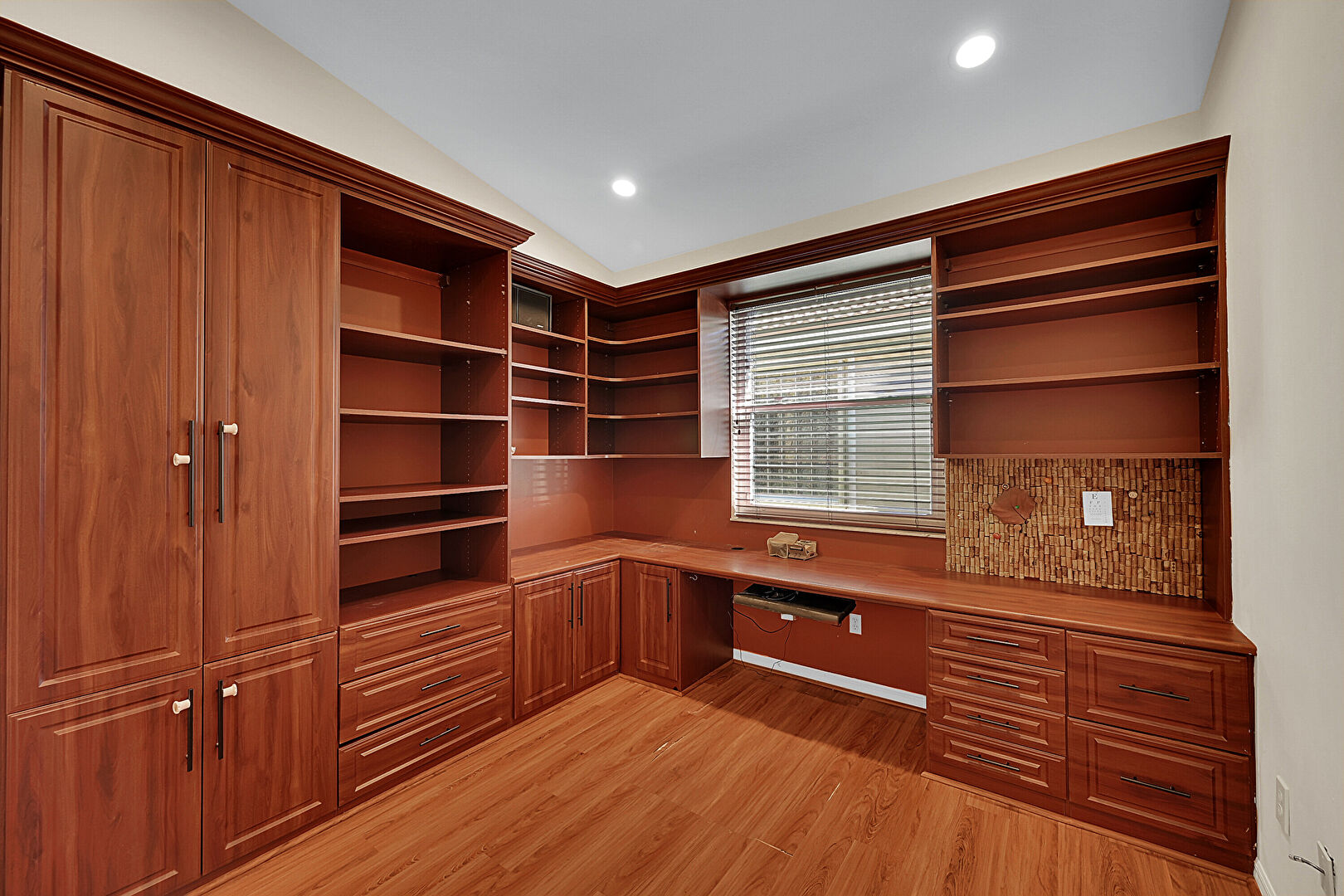 Baseboards Wall, Built In Desk, Closet, Drywall, Natural Light, Office Area, Recessed Lighting, Vaulted Ceiling, Vent, Wood Finish Floor, Baseboards Wall, Office Area