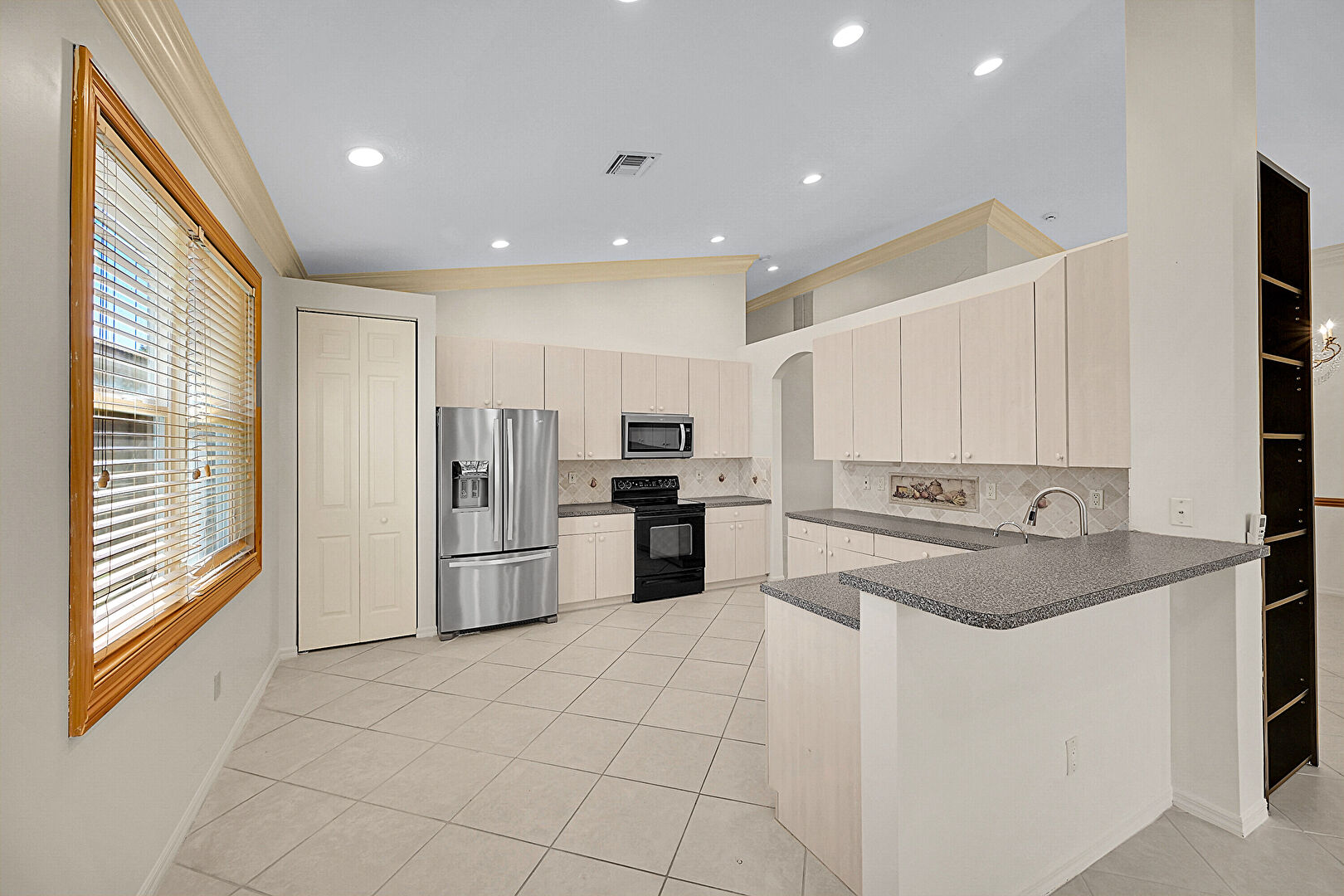 Arched Walkways, Baseboards Wall, Ceiling Fan, Crown Molding, Drywall, Flat Panel Cabinets, Kitchen Bar, Kitchen Peninsula, Natural Light, Open Shelves, Opens To Living Area, Recessed Lighting, Stone Countertops, Tile Floor, U Shaped Kitchen, Vaulted Ceiling, Vent, Drywall, Kitchen Peninsula, Natural Light, Recessed Lighting