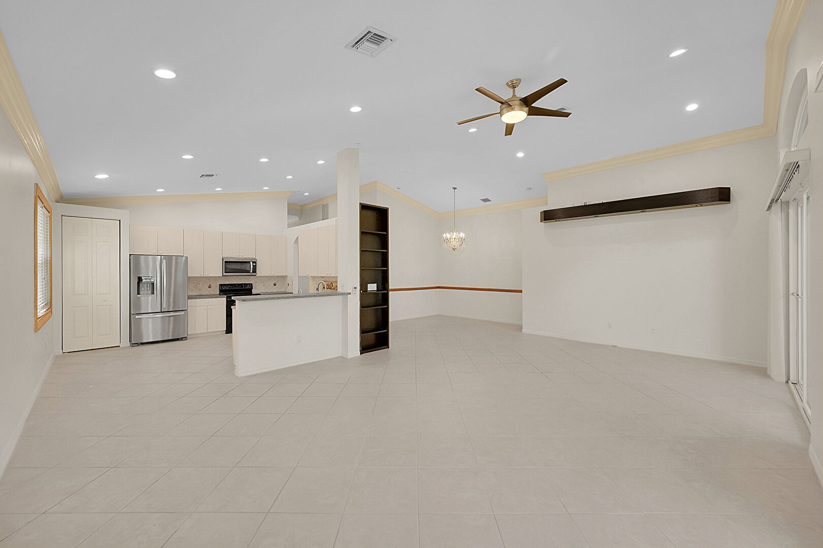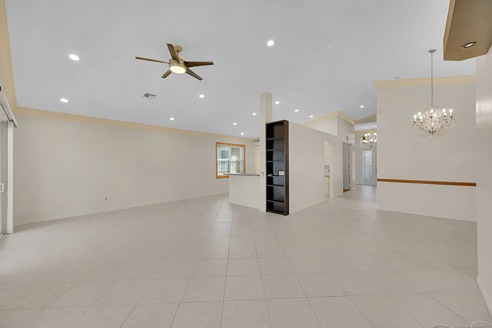 Baseboards Wall, Ceiling Fan, Crown Molding, High Ceiling, Natural Light, Notable Chandelier, Recessed Lighting, Tile Floor, Vaulted Ceiling, Vent, Drywall
