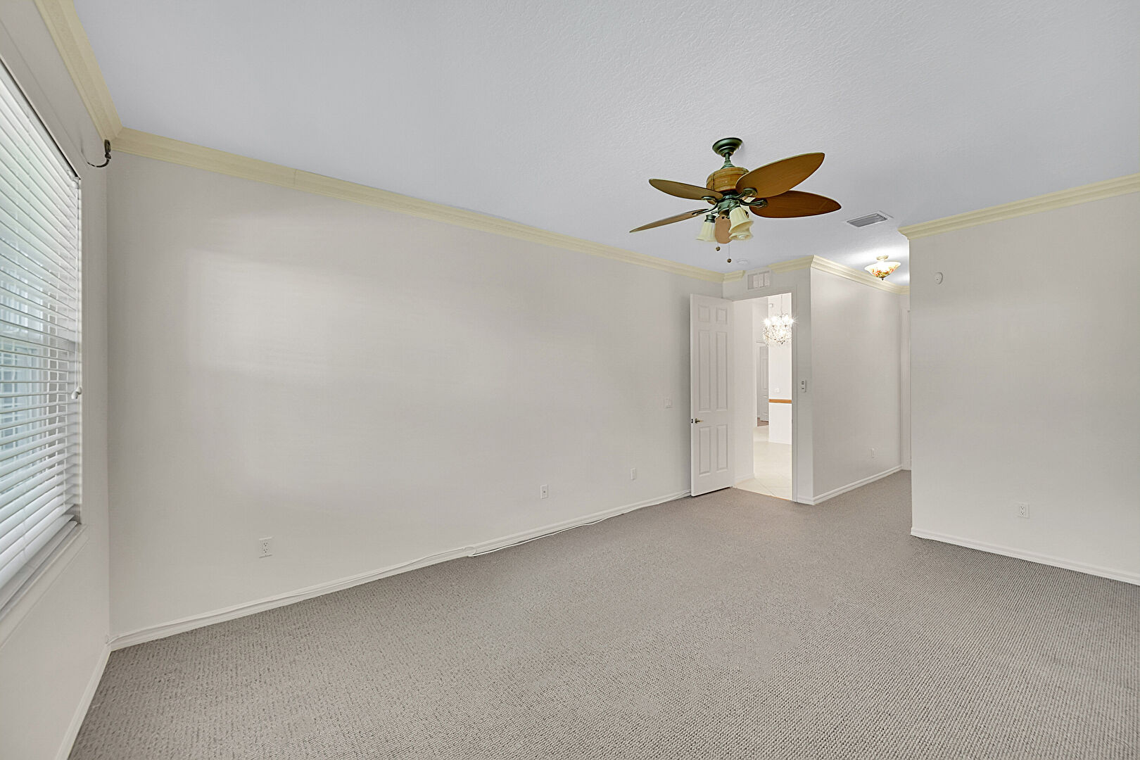 Baseboards Wall, Carpet, Ceiling Fan, Crown Molding, Drywall, Natural Light, Textured Ceiling, Vent, Baseboards Wall, Carpet, Ceiling Fan, Crown Molding