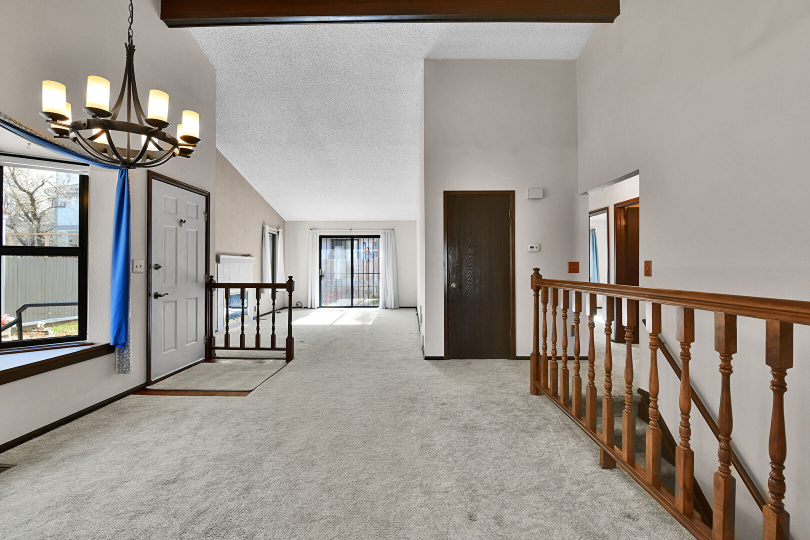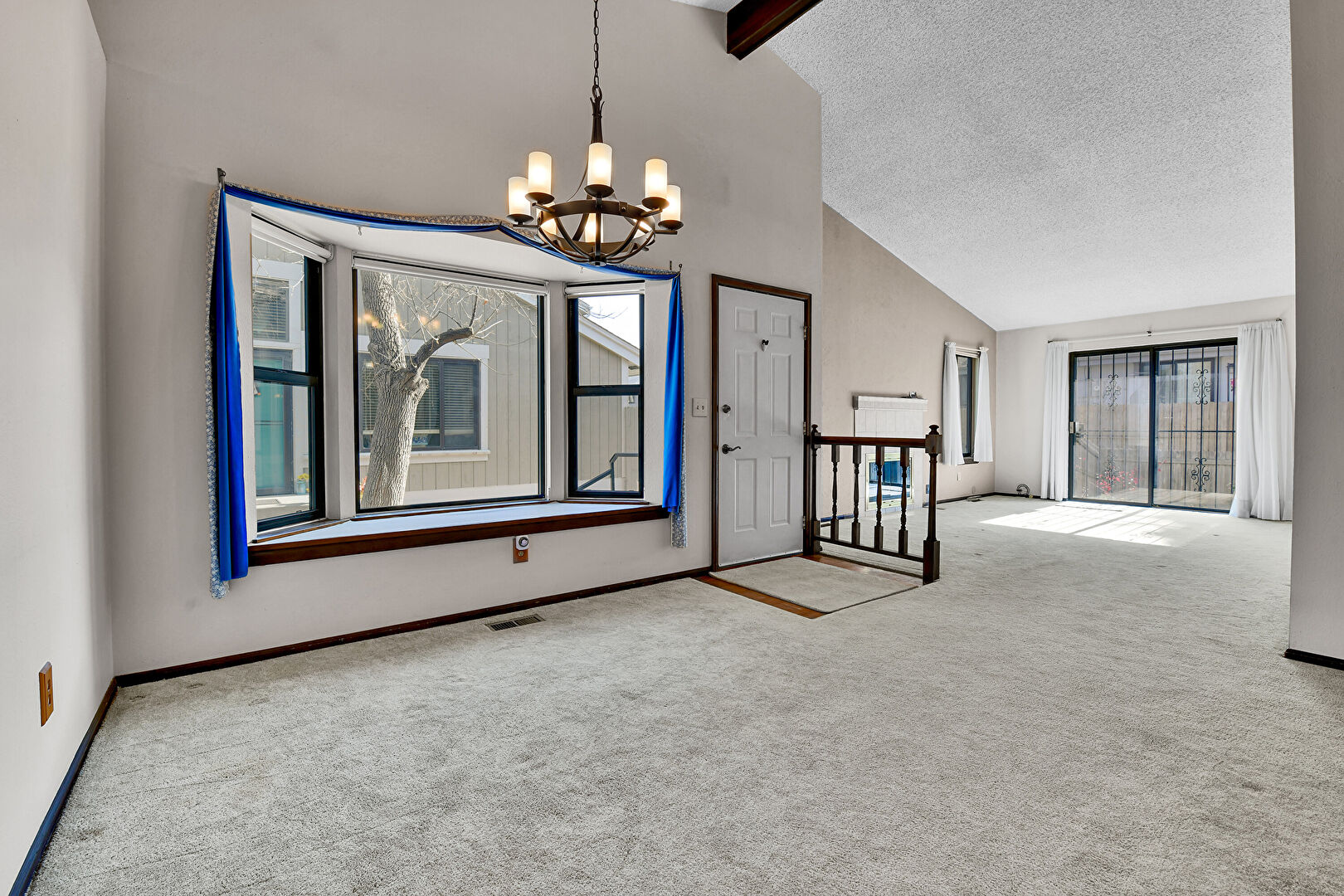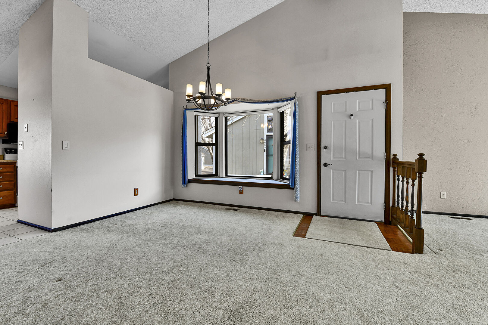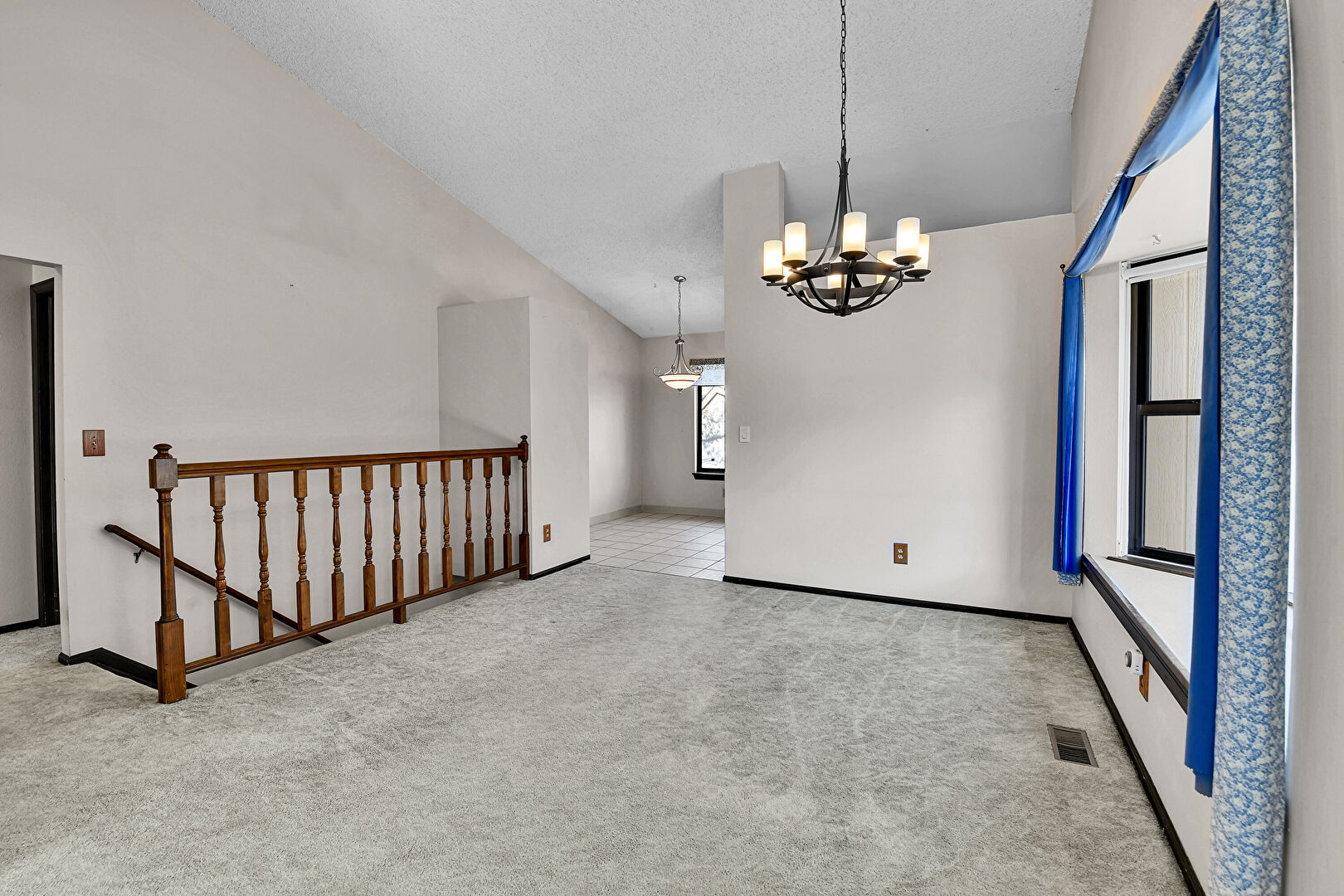 Baseboards Wall, Carpet, Drywall, High Ceiling, Natural Light, Notable Chandelier, Textured Ceiling, Vaulted Ceiling