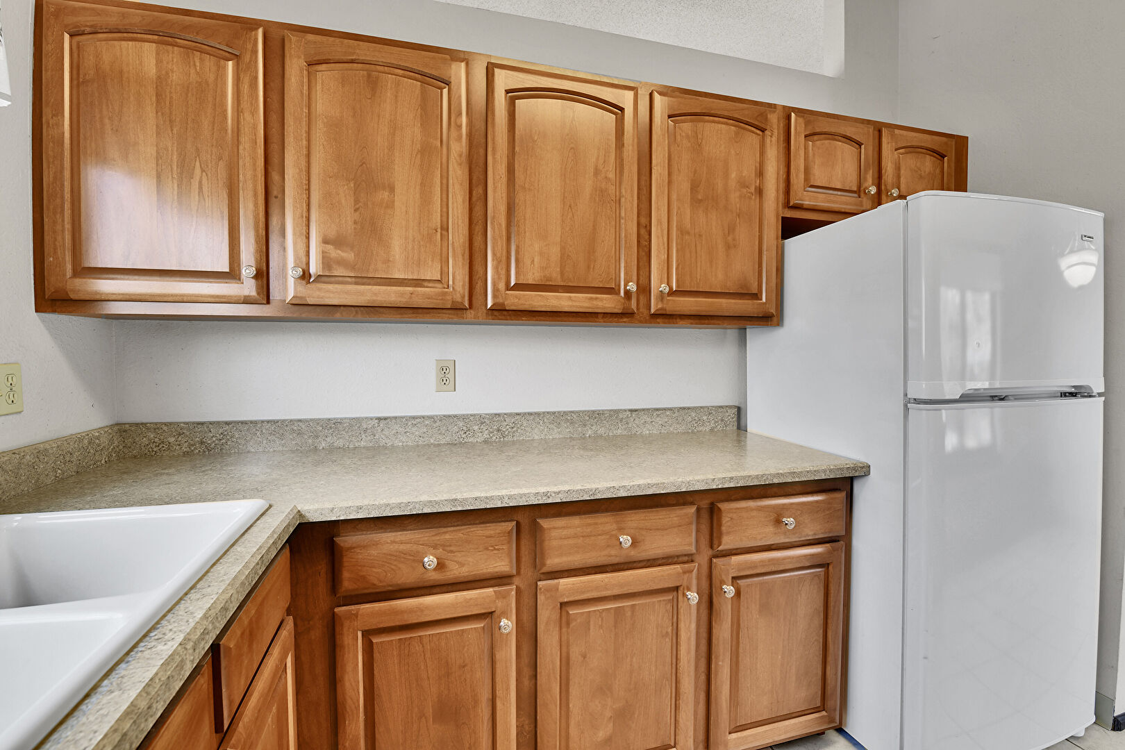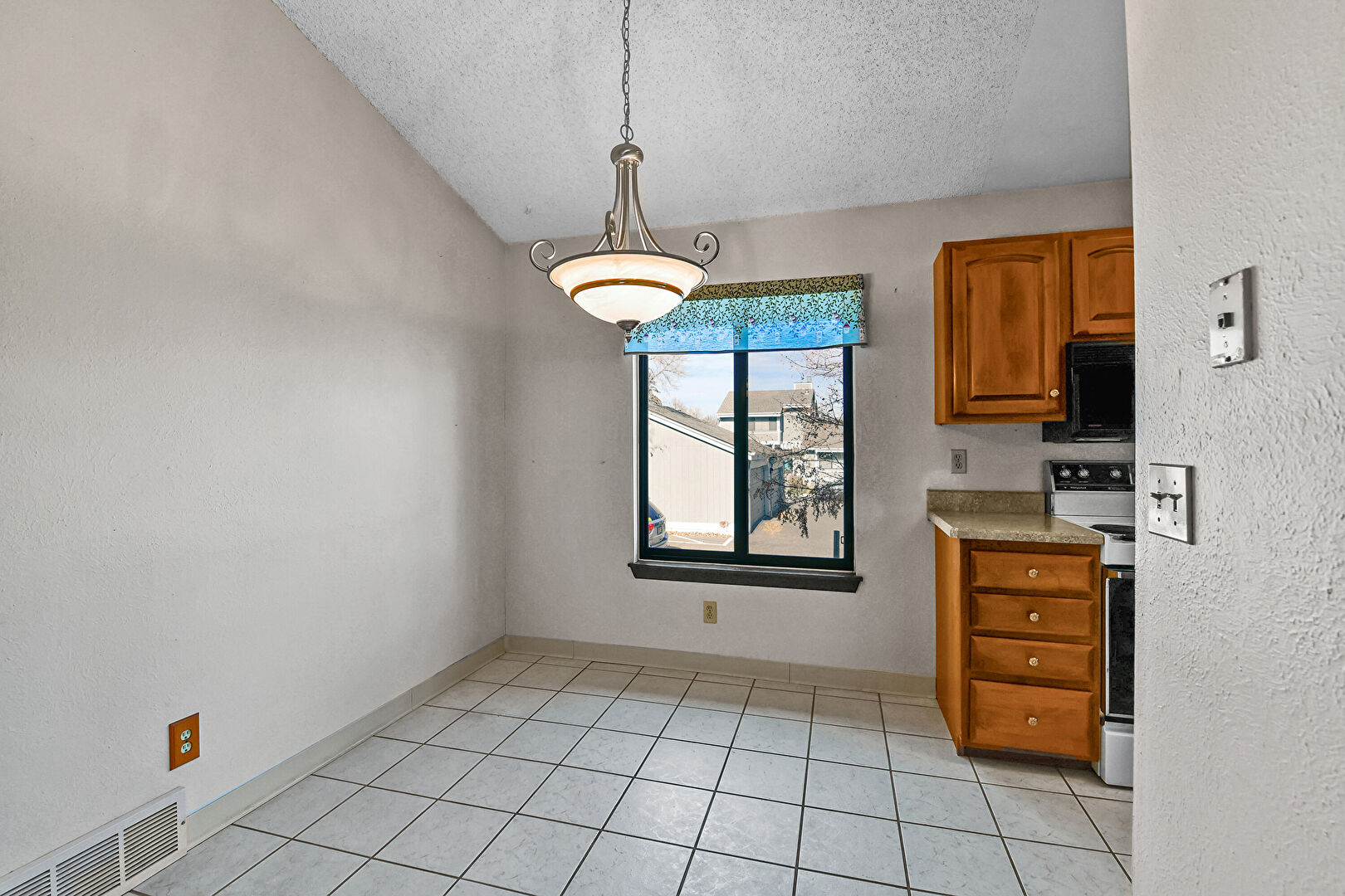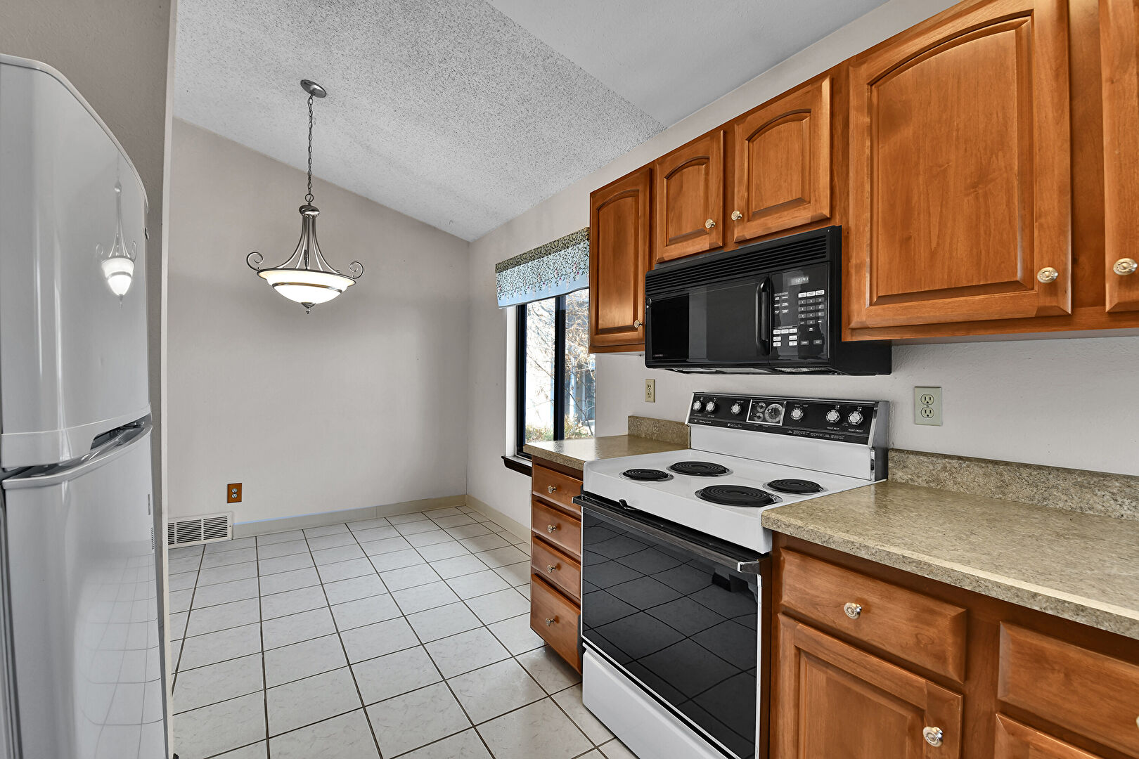 Arched Cabinets, Baseboards Wall, Drywall, Medium Brown Cabinets, Natural Light, Pendant Lighting, Raised Cabinets, Stone Countertops, Textured Ceiling, Tile Floor, Vaulted Ceiling, Vent, Arched Cabinets, Medium Brown Cabinets, Vaulted Ceiling