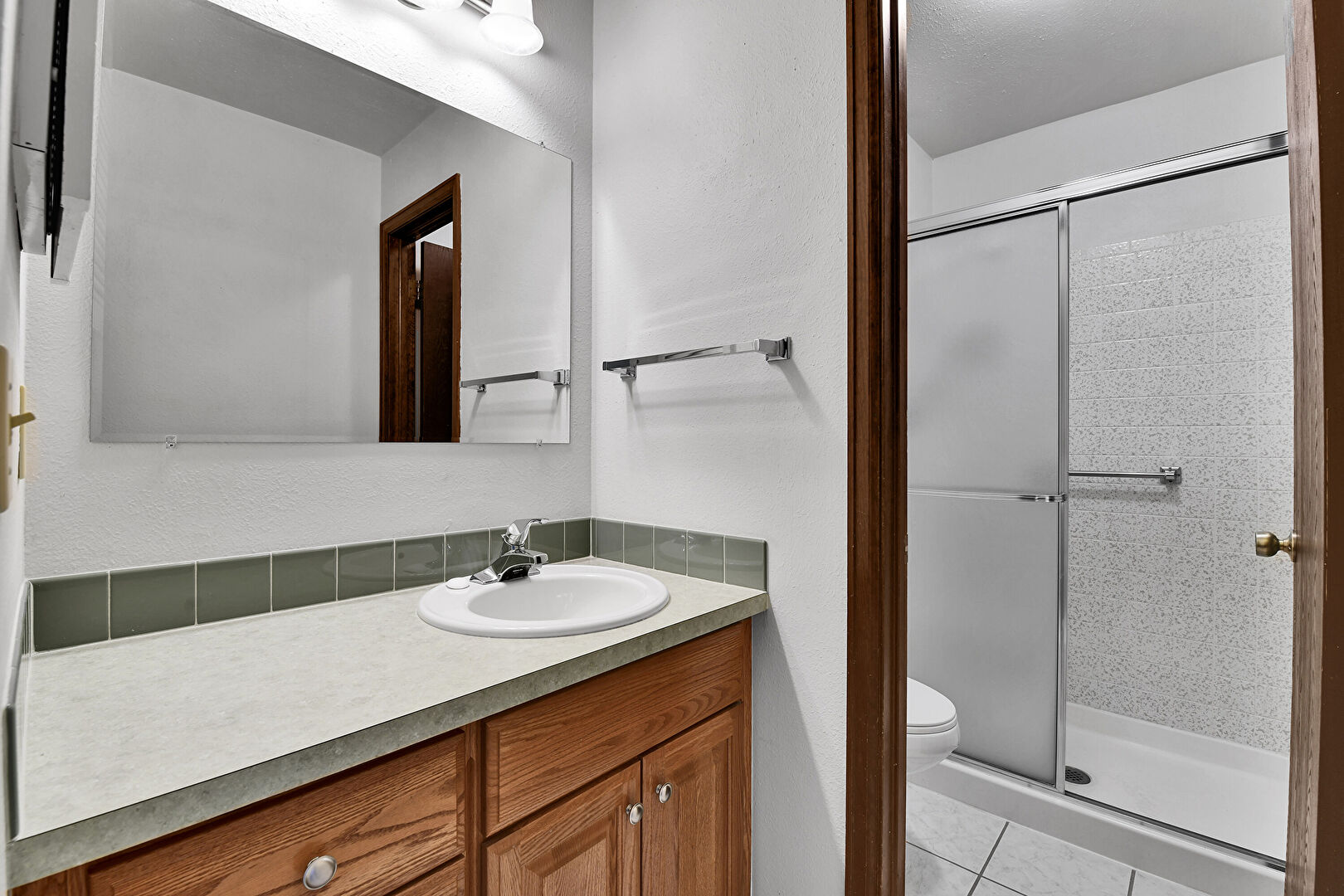 Drywall, Full Bathroom, Tile Floor, Vanity, Vent, Combined Bath Shower