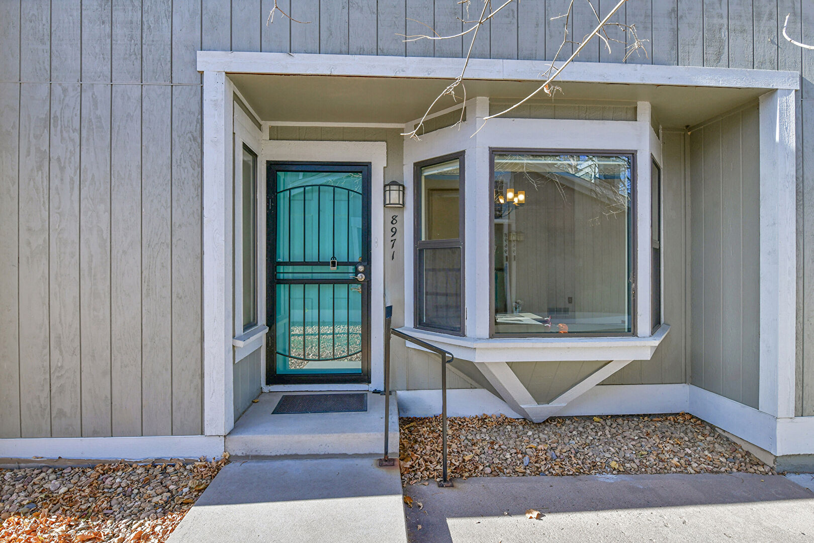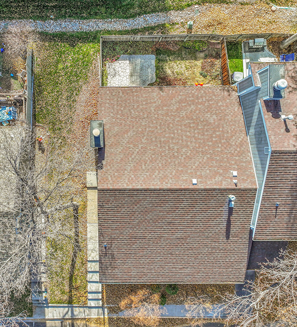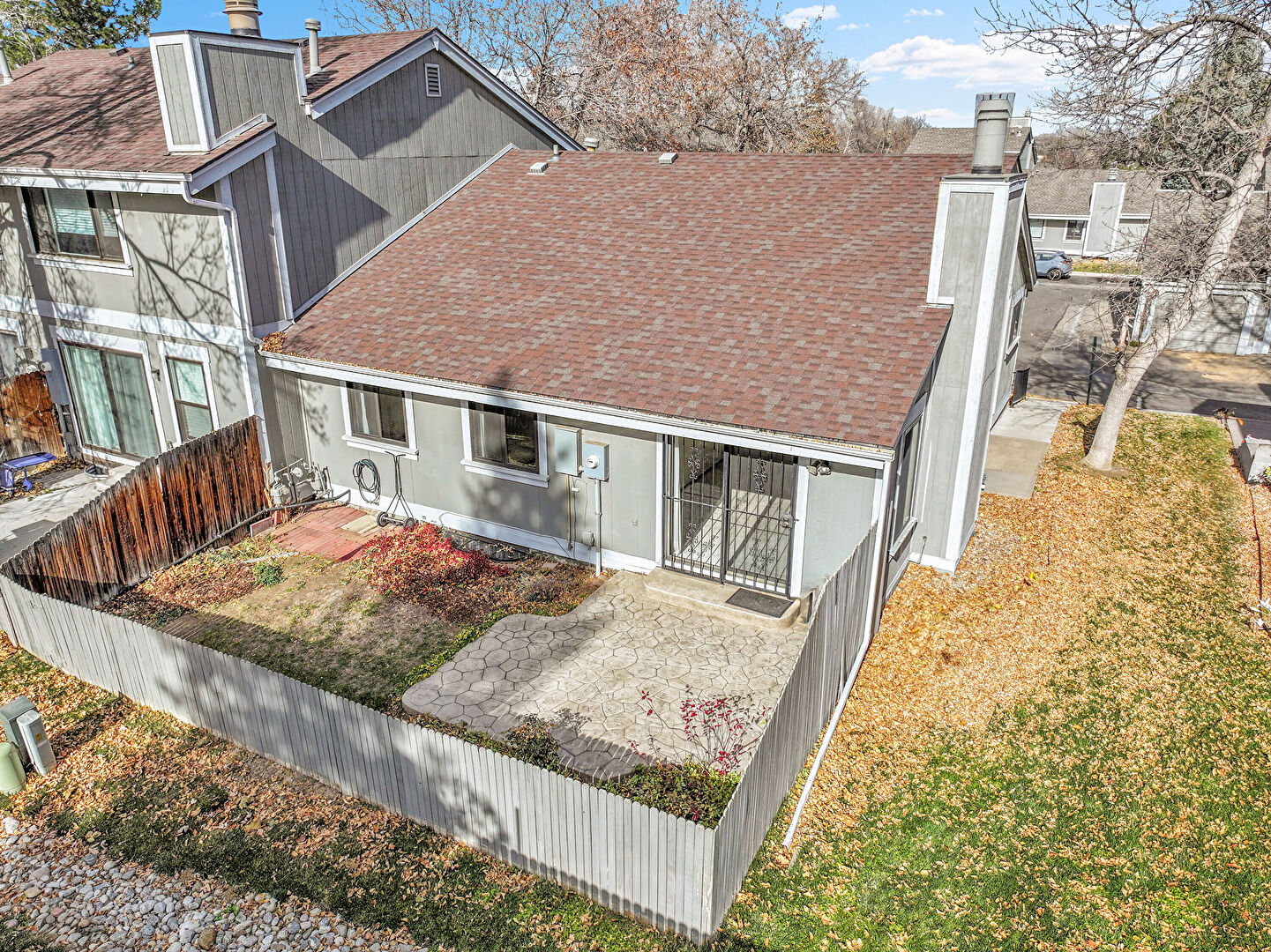 Chimney, Concrete Foundation, Downspout, Electric Meter, Fence, Gutters, Patio, Shingle Roof, Vertical Siding