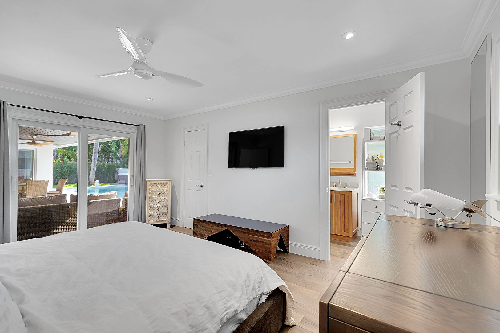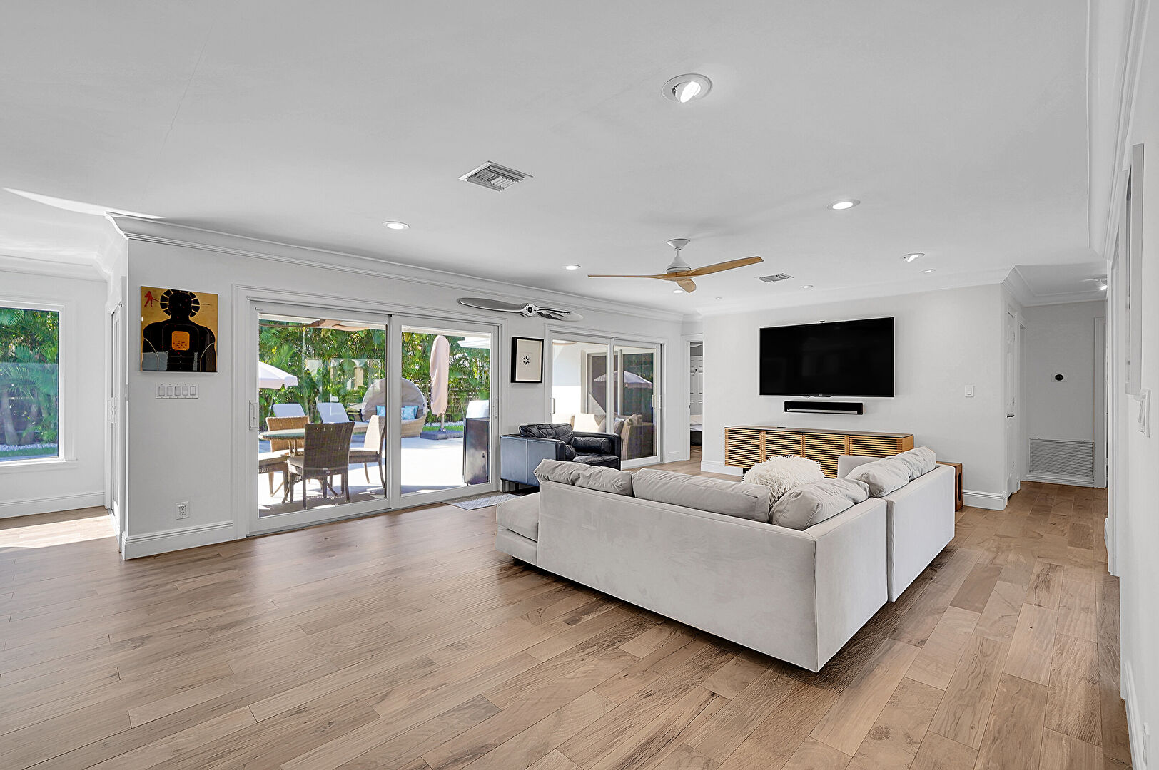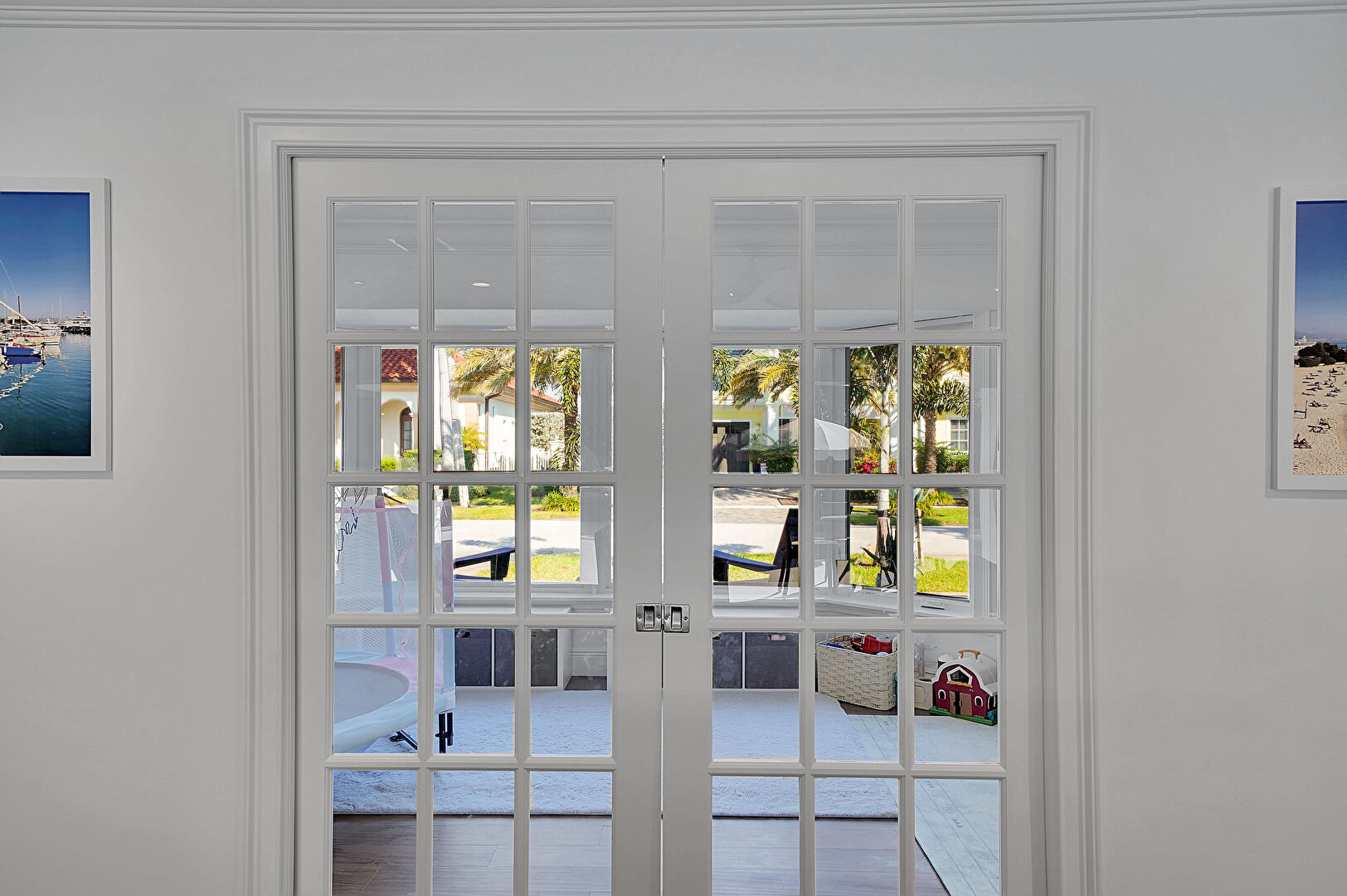 Baseboards Wall, Ceiling Fan, Crown Molding, Drywall, French Doors, Natural Light, Recessed Lighting, Vent, Wood Finish Floor, Drywall, Natural Light, Pool View, Recessed Lighting