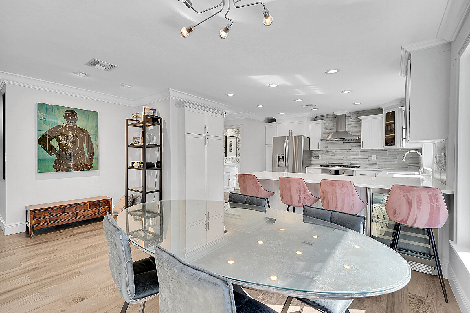Baseboards Wall, Crown Molding, Drywall, G Shaped Kitchen, Natural Light, Notable Chandelier, Recessed Lighting, Vent, Wood Finish Floor, Baseboards Wall, Crown Molding, Wood Finish Floor